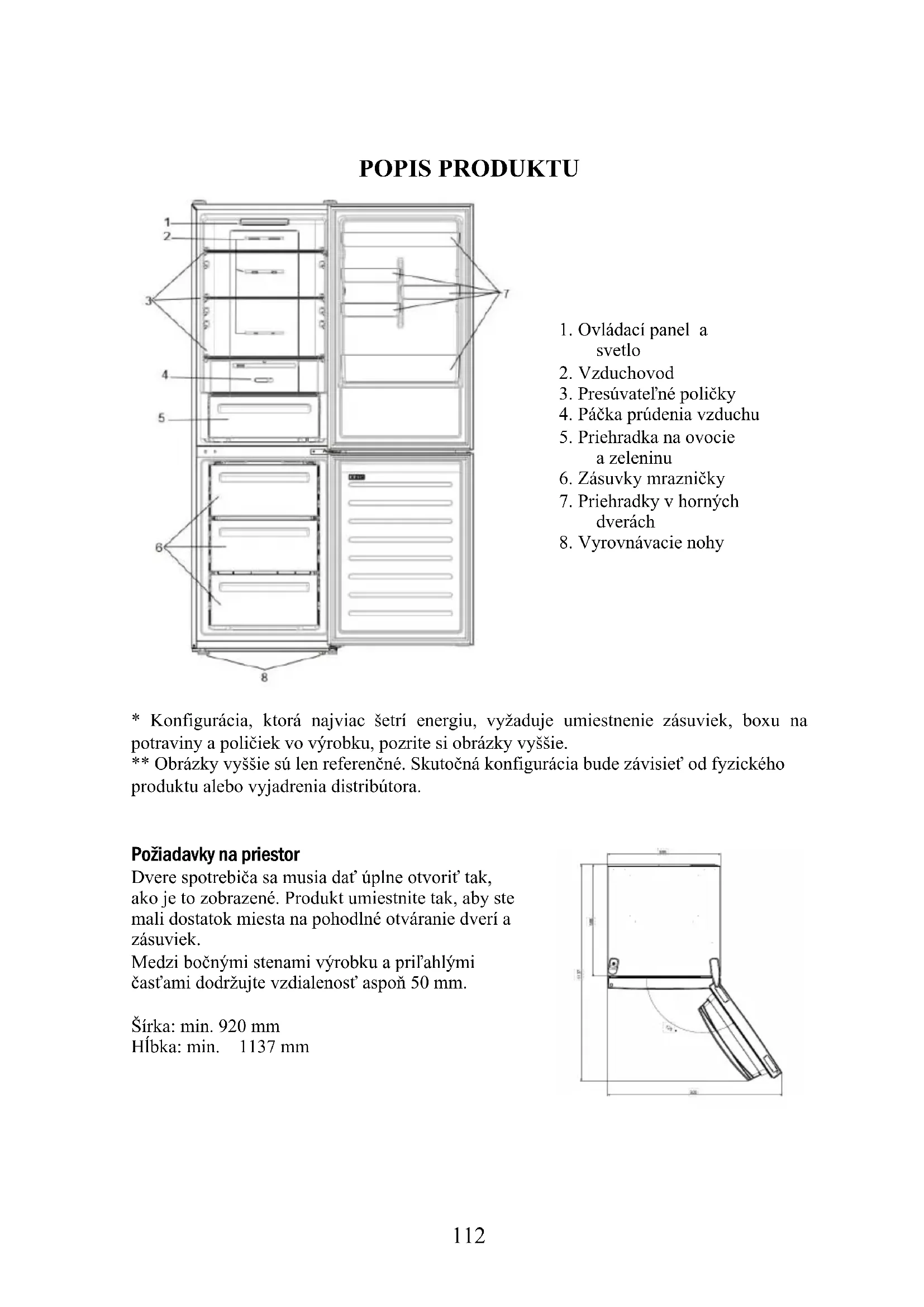- Konfigurácia, ktorá najviac šetrí energiu, vyžaduje umiestnenie zásuviek, boxu na potraviny a poličiek vo výrobku, pozrite si obrázky vyššie. ** Obrázky vyššie sú len referenčné. Skutočná konfigurácia bude závisieť od fyzického produktu alebo vyjadrenia distribútora. Požiadavky na priestor Dvere spotrebiča sa musia dať úplne otvoriť tak, ako je to zobrazené. Produkt umiestnite tak, aby ste mali dostatok miesta na pohodlné otváranie dverí a zásuviek. Medzi bočnými stenami výrobku a priľahlými časťami dodržujte vzdialenosť aspoň 50 mm. Šírka: min. 920 mm Hĺbka: min. 1137 mm113 POUŽITIE Vypínač sa používa na zapnutie/vypnutie spotrebiča. Tlačidlo NASTAVENIA sa používa na nastavenie teploty alebo na výber funkcie Super Cool. Ikona Super Cool zobrazuje, či je funkcia aktivovaná.