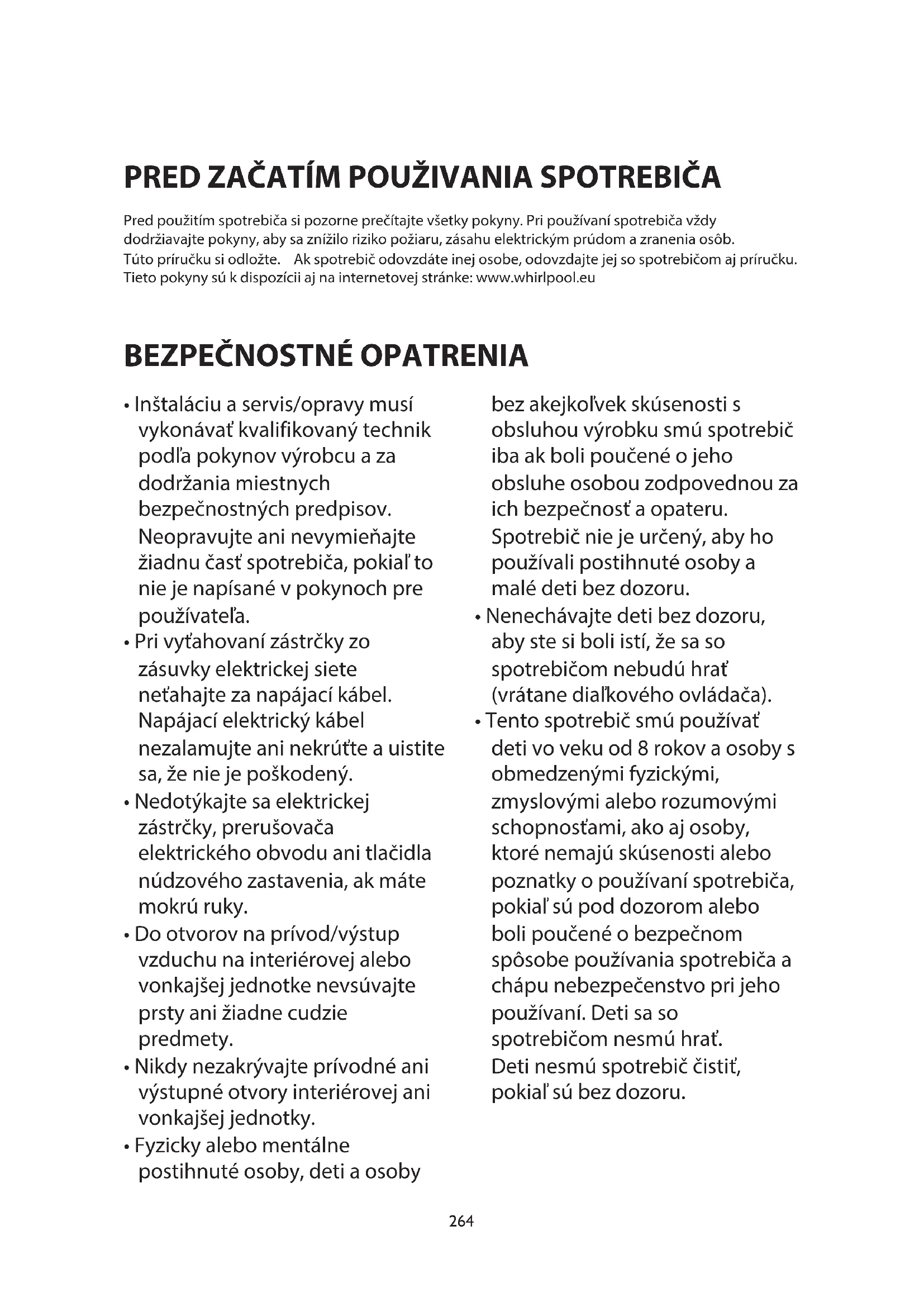 - Tento spotrebič smú používať deti vo veku od 8 rokov a osoby s obmedzenými fyzickými, zmyslovými alebo rozumovými schopnosťami, ako aj osoby, ktoré nemajú skúsenosti alebo poznatky o používaní spotrebiča, pokiaľ sú pod dozorom alebo boli poučené o bezpečnom spôsobe používania spotrebiča a chápu nebezpečenstvo pri jeho používaní. Deti sa so spotrebičom nesmú hrať. Deti nesmú spotrebič čistiť, pokiaľ sú bez dozoru.265