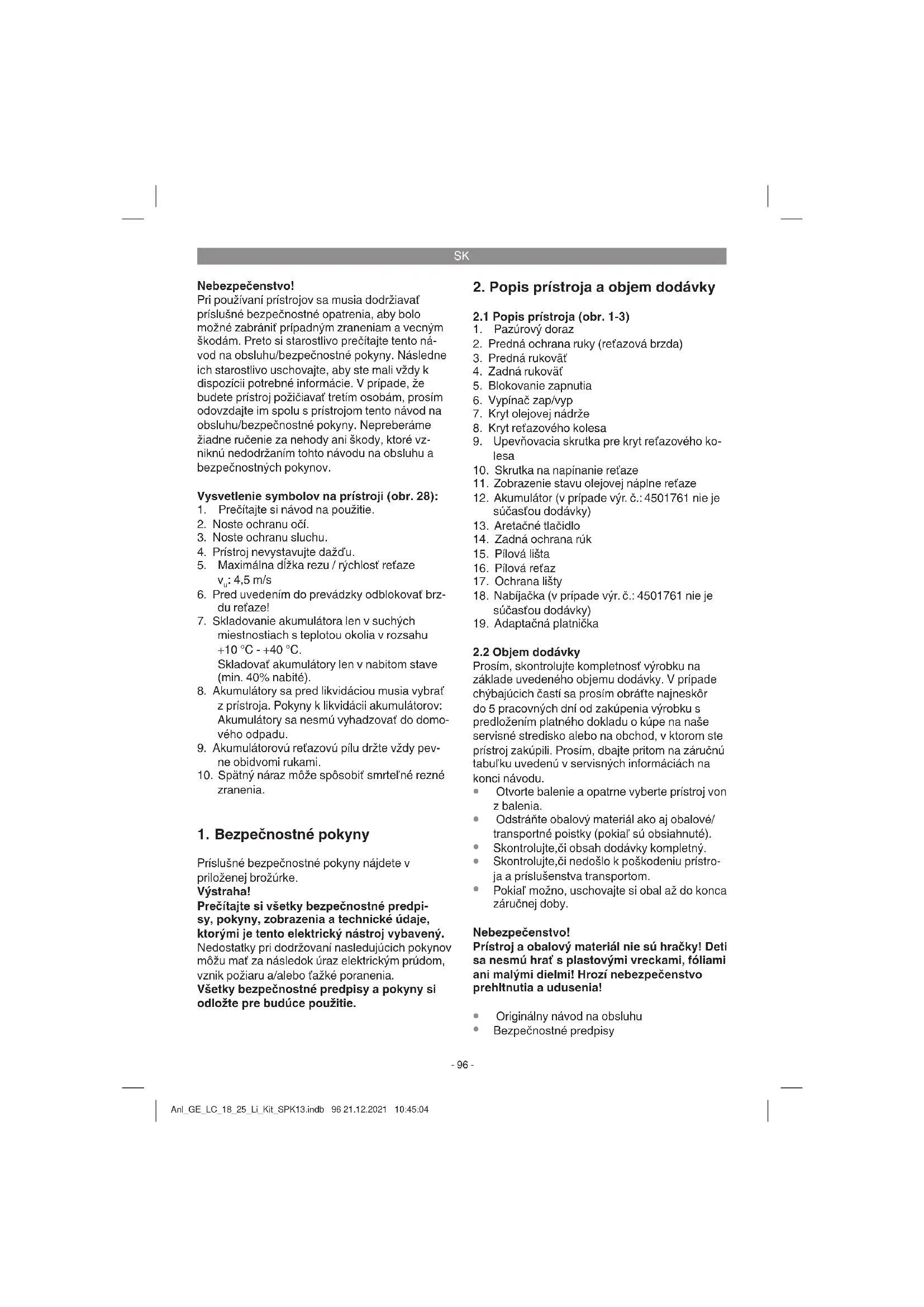 Skladujte prístroj a jeho príslušenstvo na tmavom, suchom a nezamŕzajúcom mieste mimo dosahu detí. Optimálna teplota pre skladovanie je medzi 5 až 30 °C. Skladujte tento elektrický prístroj v ori- ginálnom balení. Anl_GE_LC_18_25_Li_Kit_SPK13.indb 102 21.12.2021 10:45:05SK