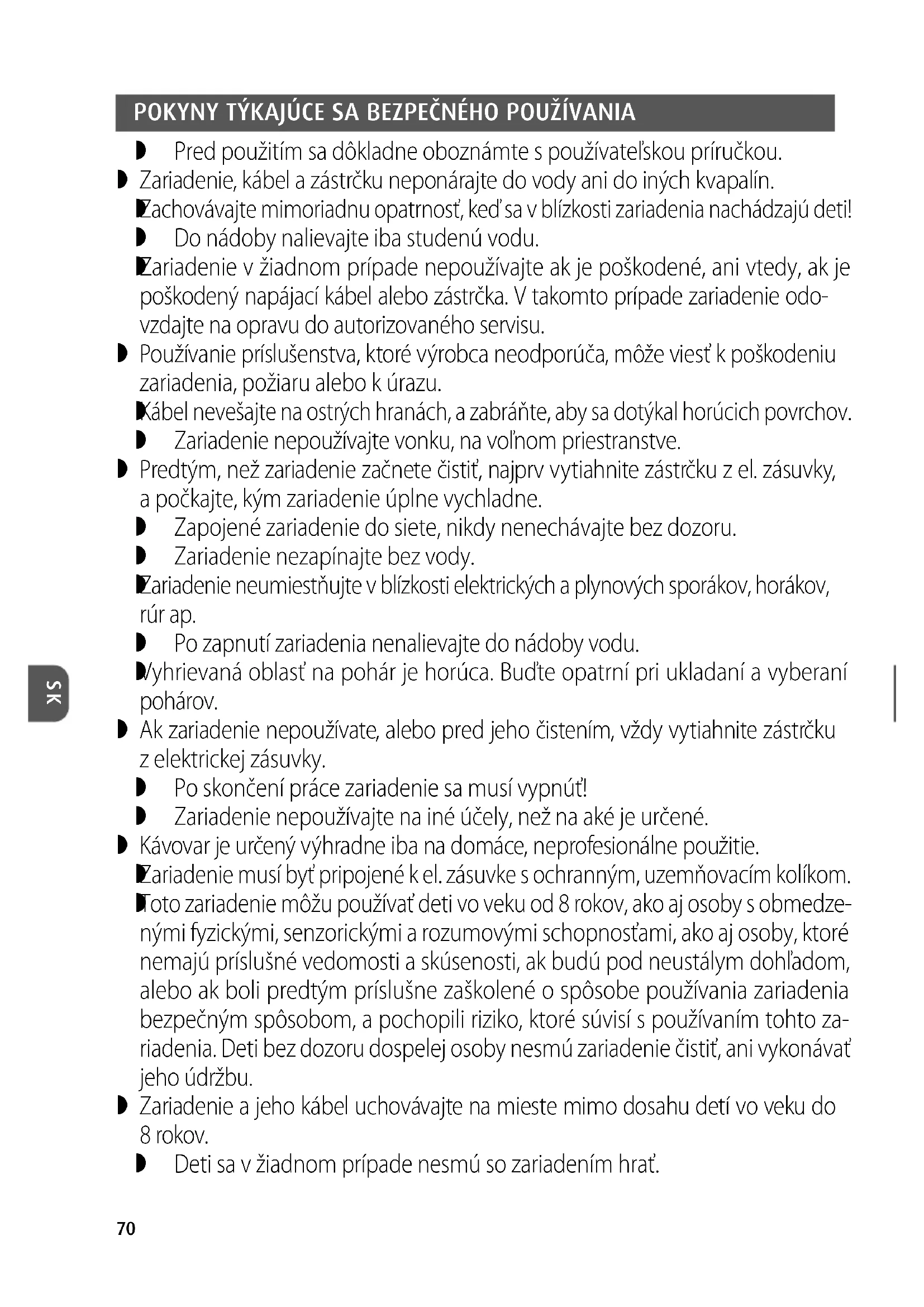 Toto zariadenie možu používat deti vo veku od 8 rokov, ako aj osoby s obmedzenymi fyzickými, senzorickými a Rozumovými schopnostami, ako aj osoby, ktoré nemajú prislušné vedomosti a skúsenosti, ak budú pod neustálym dohladom, alebo ak boli predtým prislušné zaškoléné o spôsobe používania zariadenia bezpečnám spôsobom, a pochopili riziko, ktoré suvisí s používaním tohto zariadenia. Deti bez dozoru dospelej osoby nesmú zariadenie Čistit, ani vykonávat jeho Údržbu.