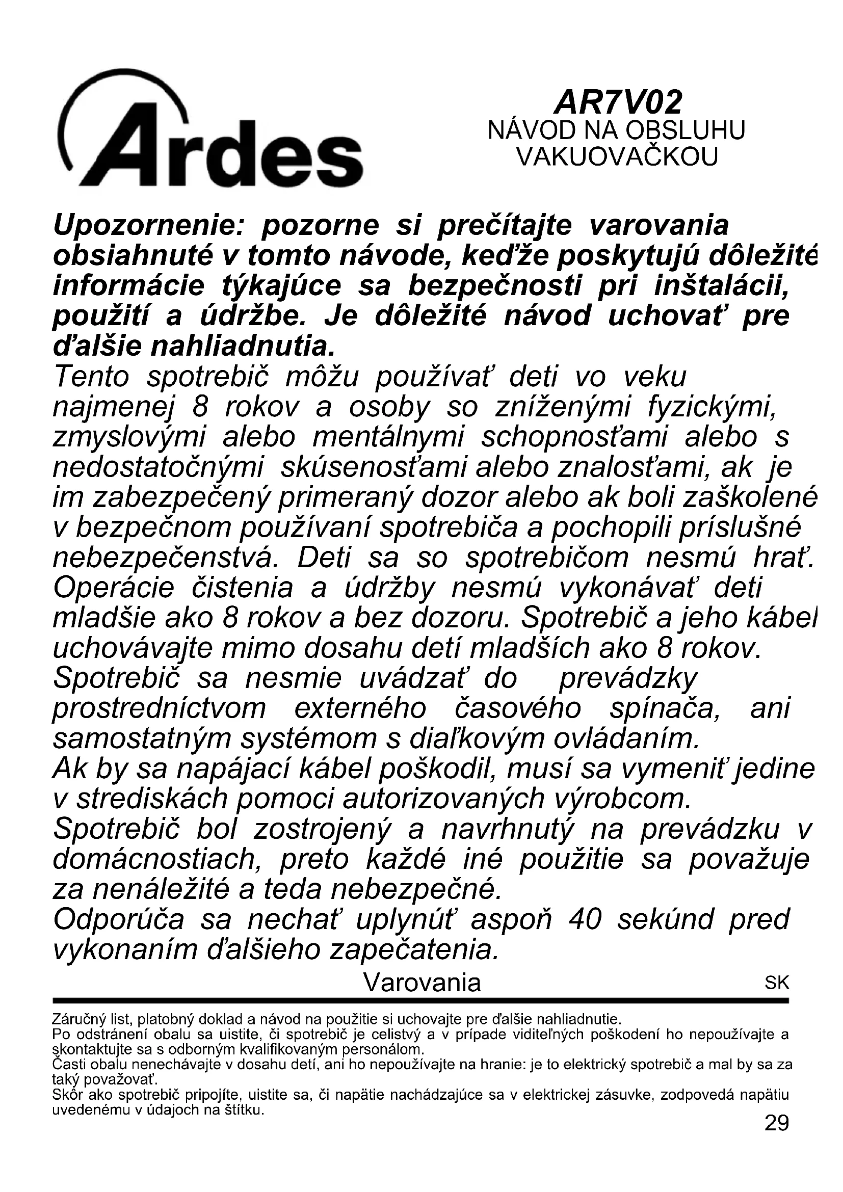 Údržba Zástrčku odpojte zo zásuvky ešte pred vykonaním akejkoľvek operácie čistenia a údržby. Spotrebič čistite iba, keď je studený. Čistenie spotrebiča sa musí vykonať jemnou a mierne navlhčenou handrou. Nepoužívajte látky, kvapaliny, ani nadmerne navlhčené handry, pretože prípadné presiaknutia by mohli spotrebič nenapraviteľne poškodiť. Na čistenie spotrebiča nepoužívajte abrazívne hubky. Úplne zabráňte tomu, aby sa látky použité na čistenie, dostali do nasávacieho potrubia, čím by spôsobili zlome- nie sacieho čerpadla. Nepoužívajte látky, ktoré môžu poškodiť tesnenie spodnej pevnej tyče. Nepoužívajte kvapalné látky, ktoré môžu spôsobiť oddelenie ochrany rezistora. Počas čistenia netlačte ani neťahajte silikónové tesnenie na hornej mobilnej tyči, zabránite tým jeho poškodeniu alebo odstráneniu, aj čiastočnému. NIKDY NEPONÁRAJTE SPOTREBIČ DO VODY. Prevádzka. Zástrčku vložte do zásuvky. Sak chcete vykonať iba úkon zapečatenia sáčku, umiestnite ho do nasávacej komory (B), zatvorte zariadenie a uistite sa, či počujete zakliknutie dvoch bočných zarážok. Stlačte tlačidlo Seal (4), ktoré sa rozsvieti, čím signalizuje, že zariadenie je v prevádzke. Keď sa vypne, stlačte uvoľňovacie tlačidlá (G) na dvoch stranách a vytiahnite sáčok. Ak si želáte zabalenie potravín vo vákuu, vložte ich do sáčku, otvor umiestnite do nasávacej komory (B), zariadenie zatvorte a uistite sa, či ste počuli zakliknutie dvoch bočných zarážok. Skôr ako spustíte nasávanie, môžete vybrať typ nasávania. Štandardne je zariadenie nastavené na NORMAL. Stlačením tlačidla MODE (2) si môžete vybrať medzi voľbami NORMAL (štandardné nasávanie) alebo GENTLE (pre jemné alebo mäkké potraviny); podľa výberu sa rozsvieti kon trolka zodpovedajúca vybratej voľbe. Stlačením tla čidla FOOD (3) si môžete vybrať nasávanie naj vhodnejšie k typu jedla , ktoré sa musí zabaliť. Štandardne je zariadenie nastavené na DRY. Pre suché potraviny zvoľte DRY , kým pre vlhkejšie potraviny MOIST; aj v tomto prípade sa rozsvieti kontrolka zodpovedajúca vybratej voľbe. V tomto bode stlačte tla čidlo Vac Seal (5). Rozsvieti sa tlačidlo; keď sa vypne, rozsvieti sa automaticky tlačidlo Seal , aby sa vykonal úkon zvárania; keď sa vypne, proces je dokončený. Stlačte uvoľňovacie tlačidlá na dvoch stranách a vytiahnite zapečatené elementy. Pre prerušenie prevádzky zariadenia v ktoromkoľvek momente stlačte kláves Stop (1). Aby sa zabránilo nadmernému vákuu na jemných potravinách, je možné predbehnúť zváranie stlačením klávesu Seal počas nasávania. UPOZORNENIE: V tomto prípade, ak by vákuum bolo príliš slabé, sáčok by sa nemusel zvariť správne. Vákuum s nádobami. Ak chcete zariadenie použiť na konzerváciu jedál vo vákuu v iných nádobách, vo výbave je zahrnutá gumená trubka , ktorá sa musí umiestniť z jedného konca ( väčšie ústie ) do nasávacej dýzy a z druhého konca do zátky (nedodáva sa) špecickej pre tento typ úkonu. Naplňte nádobu potravinami, pričom nechajte aspoň jeden centimeter medzi jedlom a horným okrajom nádoby. V prípade potreby okraj a tesnenie krytu nádoby očistite. Po dokončení príprav stačí stlačiť tlačidlo (H) pre spustenie nasávania. Nasávanie sa zastaví automaticky, keď sa dosiahne maximálne vákuum. Pre prerušenie použite to isté tlačidlo alebo tlačidlo STOP ovládacieho panelu. Aby sa tento úkon umožnil, uistite sa, či ste správne zatvorili veko nádoby. Odporúčame označiť dátum zabalenia na nádobu. Užitočné odporúčania. Na otvore, ktorý sa má zapečatiť, nechajte dostatočnú šírku tak, aby sa mohol ľahko vložiť do vákuovej komory. Skôr ako budete pokračovať, overte si, či otvor sáčku nie je mokrý, pretože by mohlo byť ťažké zapečatiť ho hermeticky. Zariadenie úplne nenahrádza chladenie alebo mrazenie, kaziace sa potraviny sa musia ešte schladiť alebo zmraziť. Plastové sáčky udržiavajte rovné, inak by zapečatenie nemuselo byť optimálne. Aby sa zabránilo vytvoreniu balíka zo sáčku počas nasávania, roztiahnite ho v nasávacej komore a držte ho stlačený, až kým zariadenie nezačne fungovať. Ovocie a zeleninu nechajte pred zapečatením na niekoľko minút vychladnúť. Pred vykonaním ďalšieho zapečatenia sa odporúča nechať uplynúť aspoň 40 sekúnd. Riešenie problémov V prípade, ak zariadenie nefunguje: Skontrolujte, či napájací kábel je pripojený do elektrickej zásuvky. Skontrolujte, či napájací kábel nie je poškodený. Skontrolujte, či elektrická zásuvka funguje, pripojením ďalšieho zariadenia. Uistite sa, či zarážky sú v blokovacej polohe. Overte, či je sáčok umiestnený správne vnútri vákuovej komory. Počkajte, kým zariadenie nevychladne 40 sekúnd, až potom ho znova použite.32 AR7V01