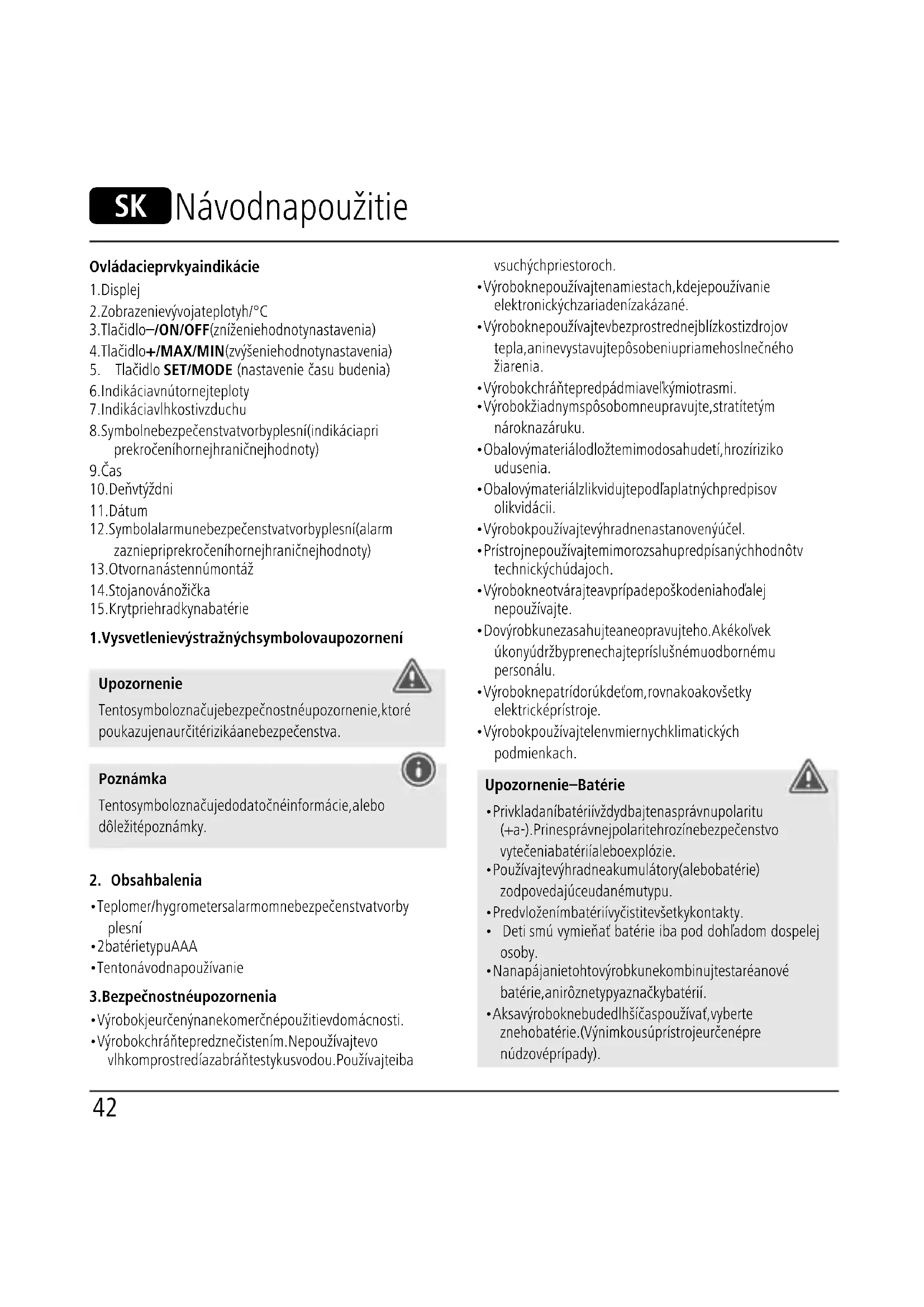 - Výrobok používajte len v miernych klimatických podmienkach. Upozornenie – Batérie