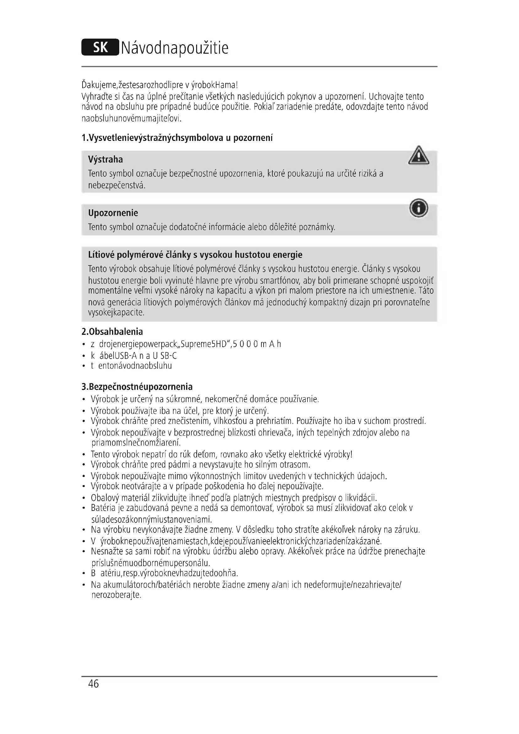 Výstraha Tento symbol označuje bezpečnostné upozornenia, ktoré poukazujú na určité riziká a nebezpečenstvá. Upozornenie Tento symbol označuje dodatočné informácie alebo dôležité poznámky. Lítiové polymérové články svysokou hustotou energie Tento výrobok obsahuje lítiové polymérové články svysokou hustotou energie. Články svysokou hustotou energie boli vyvinuté hlavne prevýrobu smartfónov,aby boli primerane schopné uspokojiť momentálne veľmi vysoké nároky na kapacitu avýkon pri malom priestorenaich umiestnenie. Táto nová generácia lítiových polymérových článkov má jednoduchý kompaktný dizajn pri porovnateľne vysokej kapacite.