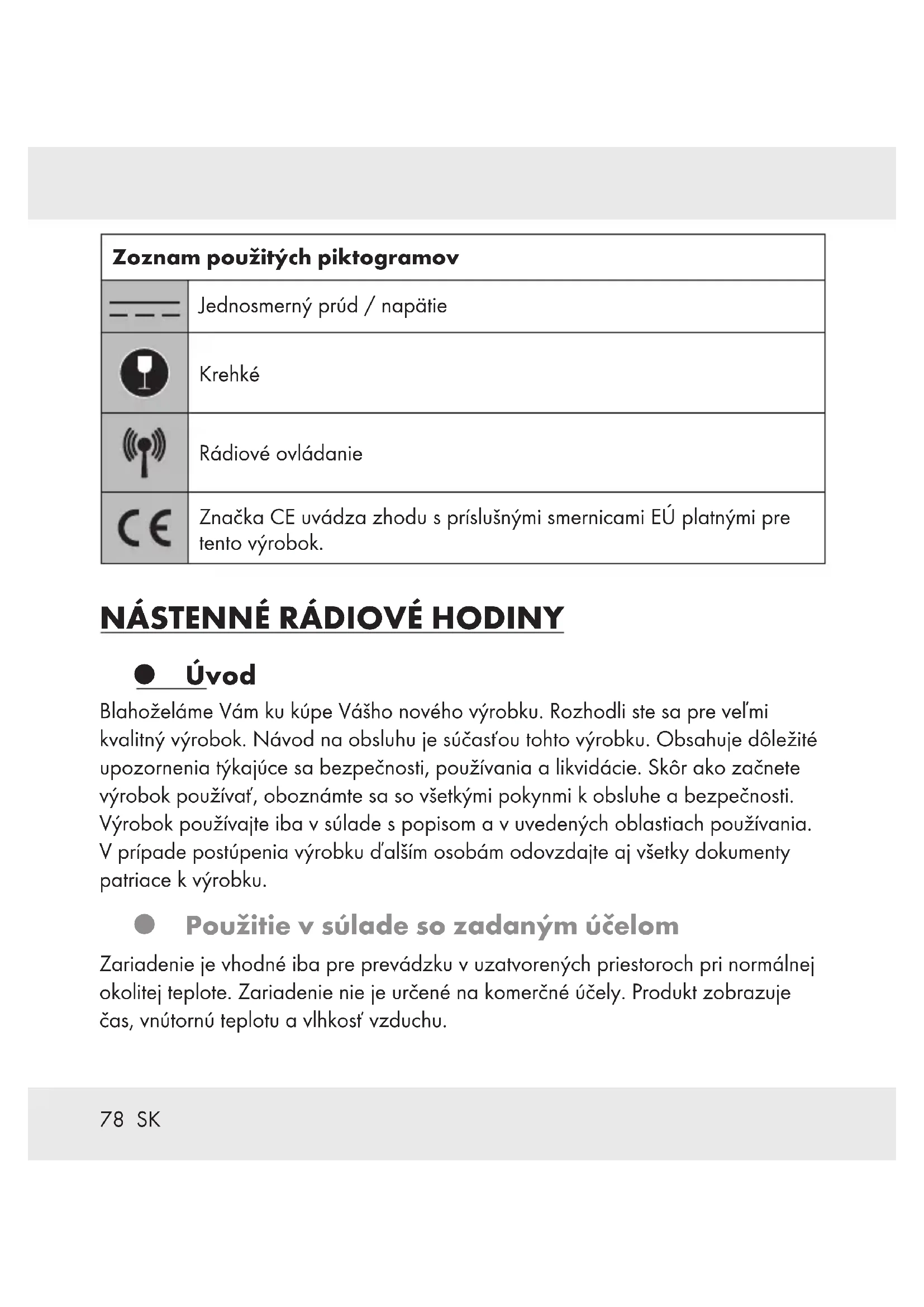 Zariadenie je vchodné iba pre prévádzku v uzatvorenych priestoroch pri normalnej okolitej teplate. Zariadenie nie je urçéné na komerçné učely. Produkt zobrazujé Čas, vnútornú teplotu a vlhost' vzduchu.