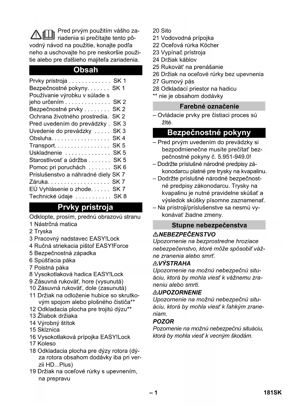 dB(A) 89 Dimensiuni şi masa Lungime mm 351 Lăţime mm 312 Înălţime mm 904 Greutate tipică de operare kg 20,5 180 RO– 1 Pred prvým použitím vášho za- riadenia si prečítajte tento pô- vodný návod na použitie, konajte podľa neho a uschovajte ho pre neskoršie použi- tie alebo pre ďalšieho majiteľa zariadenia. Odklopte, prosím, prednú obrazovú stranu 1 Nástrčná matica 2 Tryska 3 Pracovný nadstavec EASY!Lock 4 Ručná striekacia pištoľ EASY!Force 5 Bezpečnostná západka 6 Spúšťacia páka 7 Poistná páka 8 Vysokotlaková hadica EASY!Lock 9 Zásuvná rukoväť, hore (vysunutá) 10 Zásuvná rukoväť, dole (zasunutá) 11 Držiak na odloženie hubice so skrutko- vým spojom alebo plošného čističa** 12 Odkladacia plocha pre trojitú dýzu** 13 Žliabok držiaka 14 Výrobný štítok 15 Sklznica 16 Vysokotlaková prípojka EASY!Lock 17 Koleso 18 Odkladacia plocha pre dýzy rotora (dý- za rotora obsahom dodávky iba pri ver- zii HD...Plus) 19 Držiak na oceľové rúrky s upevnením, na prepravu 20 Sito 21 Vodovodná prípojka 22 Oceľová rúrka Köcher 23 Vypínač prístroja 24 Držiak káblov 25 Rukovät' na prenášanie 26 Držiak na oceľové rúrky bez upevnenia 27 Gumový pás 28 Odkladací priestor na hadicu ** nie je obsahom dodávky – Ovládacie prvky pre čistiaci proces sú žlté. – Pred prvým uvedením do prevádzky si bezpodmienečne musíte prečítat' bez- pečnostné pokyny č. 5.951-949.0! – Dodržte príslušné národné predpisy zá- konodarcu platné pre trysky na kvapalinu. – Dodržte príslušné národné bezpečnost- né predpisy zákonodarcu. Trysky na kvapalinu je nutné pravidelne skúšať a výsledok skúšky písomne zaznamenať. – Na prístroji/príslušenstve sa nesmú vy- konávať žiadne zmeny. NEBEZPEČENSTVO Upozornenie na bezprostredne hroziace nebezpečenstvo, ktoré môže spôsobiť váž- ne zranenia alebo smrť. 몇 VÝSTRAHA Upozornenie na možnú nebezpečnú situ- áciu, ktorá by mohla viesť k vážnemu zra- neniu alebo smrti. 몇 UPOZORNENIE Upozornenie na možnú nebezpečnú situ- áciu, ktorá by mohla viesť k ľahkým zrane- niam. POZOR Pozornenie na možnú nebezpečnú situáciu, ktorá by mohla viesť k vecným škodám. Obsah Prvky prístroja . . . . . . . . . . . . . SK 1 Bezpečnostné pokyny. . . . . . . SK 1 Používanie výrobku v súlade s jeho určením . . . . . . . . . . . . . . SK 2 Bezpečnostné prvky . . . . . . . . SK 2 Ochrana životného prostredia. SK 2 Pred uvedením do prevádzky . SK 3 Uvedenie do prevádzky . . . . . SK 3 Obsluha. . . . . . . . . . . . . . . . . . SK 4 Transport. . . . . . . . . . . . . . . . . SK 5 Uskladnenie . . . . . . . . . . . . . . SK 5 Starostlivosť a údržba . . . . . . . SK 5 Pomoc pri poruchách . . . . . . . SK 6 Príslušenstvo a náhradné diely SK 7 Záruka. . . . . . . . . . . . . . . . . . . SK 7 EÚ Vyhlásenie o zhode. . . . . . SK 7 Technické údaje . . . . . . . . . . . SK 8 Prvky prístroja Farebné označenie Bezpečnostné pokyny Stupne nebezpečenstva 181SK– 2 Vysokotlakový prúd môže byť pri neodbornom použití nebezpečný. Prúd sa nesmie nasmerovať na osoby, zvieratá, aktívne elektrické zariade- nia alebo na samotný prístroj. Podľa platných predpisov sa ne- smie zariadenie prevádzkovať v sieti pitnej vody bez systémového oddeľovacieho zariadenia. Musíte použiť systémové oddeľovacie zariadenie firmy KÄRCHER alebo alternatívne systé- mové oddeľovacie zariadenie podľa EN 12729 typ BA. Voda, ktorá preteká cez systémový odlučo- vač, nie je pitná. Toto vysokotlakové čistiace zariadenie po- užívajte výhradne – na čistenie vysokotlakým lúčom (napr. čistenie fasád, teras, záhradných prís- trojov). Pomocou voliteľného príslušenstva sa dá primiešať čistiaci prostriedok. Pri silne priľnutých nečistotách odporúča- me dýzu rotora (obsahom dodávky iba pri verzii HD...Plus) Požiadavky na kvalitu vody: POZOR Ako vysokotlakové médium sa smie použí- vať len čistá voda. Nečistoty spôsobujú predčasné opotrebovanie alebo vznik usa- denín v zariadení. Ak sa použije recyklovaná voda, nemôžu sa prekročiť nasledujúce hraničné hodnoty. Bezpečnostné zariadenia slúžia na ochra- nu užívateľa a nesmie sa vyradiť z prevádz- ky alebo obchádzať jeho funkcie. Pri uvoľnení poistnej páky ručnej striekacej pištole sa vypne tlakový spínač čerpadla, ktorý zastaví vysokotlakový prúd vody. Po potiahnutí poistnej páky sa čerpadlo znova zapne. Elektrické a elektronické prístroje často ob- sahujú súčasti, ktoré môžu pri nesprávnom zaobchádzaní alebo nesprávnej likvidácii predstavovať potenciálne nebezpečenstvo pre ľudské zdravie a životné prostredie. Tieto súčasti sú však potrebné pre správnu prevádzku prístroja. Prístroje označené Symboly na prístroji Používanie výrobku v súlade s jeho určením Hodnota pH 6,5...9,5 elektrická vodivosť * Vodivosť čerstvej vody +1200 μS/cm usadeniny ** < 0,5 mg/l látky s možnosťou filtrácie
