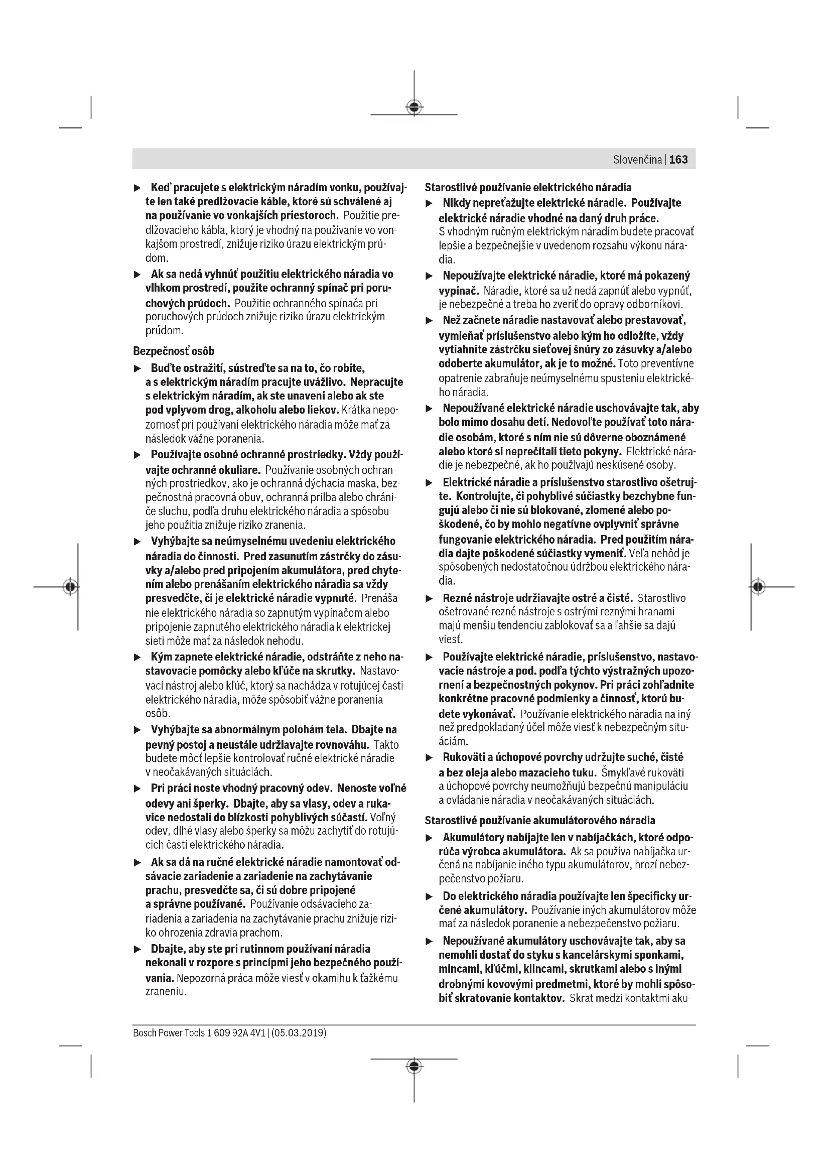 22CF | 23 | 29CF | 30 Tenkou čepelí šroubováku, špachtlí nebo podobným nástrojem stiskněte označovací kroužek (17). Kleštěmi na pojistné kroužky posuňte pojistný kroužek (33) na krytu dozadu. Obě poloviny držáku LED (16), které obepínají LED pracovní světlo (18) lze nyní nastavit do jakékoli požadované polohy. Dbejte na to, abyste nepoškodili kabel LED pracovního světla, aaniž byste ho zalomili, zasuňte ho do určené dutiny (34) vkrytu. LED pracovní světlo (18) znovu uzavřete oběma polovinami krytu držáku LED (16). Pojistný kroužek (33) aoznačovací kroužek (17) zatlačte zpět do původní polohy. Údržba aservis Údržba ačištění u Před každou prací na elektronářadí (např. údržba, výměna nástrojů) apři jeho přepravě auskladnění vyjměte akumulátor. Při neúmyslném stisknutí vypínače hrozí nebezpečí poranění. u Udržujte elektronářadí avětrací otvory čisté, aby pracovalo dobře abezpečně. Mazání elektronářadí Mazivo: speciální převodový tuk (225ml) číslo zboží 3 605 430 009 tuk Molykote motorový olej SAE 10/SAE 20 – Po prvních 150provozních hodinách vyčistěte převodovku pomocí jemného rozpouštědla. Řiďte se pokyny výrobce rozpouštědla kpoužití alikvidaci. Poté převodovku namažte speciálním převodovým tukem Bosch. Proces čištění opakujte pokaždé po 300provozních hodinách od prvního vyčištění. – Pohyblivé díly rozpojovací spojky namažte po 100000 šroubováních několika kapkami motorového oleje SAE10/ SAE20. Kluzné aotočné díly namažte tukem Molykote. Při této příležitosti zkontrolujte, zda spojka není opotřebená, aby bylo zajištěno, že není ovlivněna Bosch Power Tools 1 609 92A 4V1 | (05.03.2019)162 | Slovenčina opakovatelnost apřesnost. Poté se musí znovu nastavit krouticí moment spojky. u Údržbou aopravami pověřujte pouze kvalifikované odborné pracovníky. Tím bude zajištěno, že zůstane zachovaná bezpečnost elektronářadí. Autorizované servisní středisko Bosch provádí tyto práce rychle aspolehlivě. u Mazací ačisticí látky ekologicky zlikvidujte. Dodržujte zákonné předpisy. Zákaznická služba aporadenství ohledně použití Zákaznická služba zodpoví vaše dotazy kopravě aúdržbě vašeho výrobku atéž knáhradním dílům. Rozkladové výkresy ainformace onáhradních dílech najdete také na: www.bosch-pt.com Vpřípadě dotazů knašim výrobkům apříslušenství vám ochotně pomůže poradenský tým Bosch. Vpřípadě veškerých otázek aobjednávek náhradních dílů bezpodmínečně uveďte 10místné věcné číslo podle typového štítku výrobku. Czech Republic Robert Bosch odbytová s.r.o. Bosch Service Center PT K Vápence 1621/16 692 01 Mikulov Na www.bosch-pt.cz si si můžete objednat opravu Vašeho stroje nebo náhradní díly online. Tel.: +420 519 305700 Fax: +420 519 305705 E-Mail: servis.naradi@cz.bosch.com www.bosch.cz Likvidace Elektronářadí, akumulátory, příslušenství aobaly se musí odevzdat kekologické recyklaci. Elektronářadí aakumulátory/baterie nevyhazujte do domovního odpadu! Pouze pro zeměEU: Podle evropské směrnice 2012/19/EU se musí již nepoužitelné elektronářadí apodle evropské směrnice 2006/66/ES vadné nebo opotřebované akumulátory/ baterie shromažďovat odděleně aodevzdat kekologické recyklaci. Akumulátory/baterie: Ni-Cd: nikl-kadmiové Pozor: Tyto akumulátory obsahují kadmium, vysoce jedovatý těžký kov. Ni-MH: nikl-metal hydridové Slovenčina Bezpečnostné upozornenia Všeobecné bezpečnostné upozornenia pre elektrické náradie VÝSTRAHA Prečítajte si všetky bezpečnostné upozornenia, pokyny, ilustrácie ašpecifikácie dodané stýmto elektrickým náradím. Nedodržiavanie všetkých uvedených pokynov môže mať za následok úraz elektrickým prúdom, požiar a/alebo ťažké poranenie. Tieto výstražné upozornenia abezpečnostné pokyny starostlivo uschovajte na budúce použitie. Pojem „elektrické náradie“ používaný vnasledujúcom texte sa vzťahuje na elektrické náradie napájané zo siete (sprívod- nou šnúrou) ana elektrické náradie napájané akumulátoro- vou batériou (bez prívodnej šnúry). Bezpečnosť na pracovisku u Pracovisko vždy udržiavajte čisté adobre osvetlené. Neporiadok aneosvetlené priestory pracoviska môžu mať za následok pracovné úrazy. u Nepoužívajte elektrické náradie vo výbušnom pro- stredí, napr. tam, kde sa nachádzajú horľavé kvapali- ny, plyny alebo horľavý prach. Ručné elektrické náradie vytvára iskry, ktoré by mohli zapáliť prach alebo výpary. u Nedovoľte deťom ainým nepovolaným osobám, aby sa počas používania elektrického náradia zdržiavali vblízkosti pracoviska. Pri rozptyľovaní môžete stratiť kontrolu nad náradím. Bezpečnosť – elektrina u Zástrčka prívodnej šnúry elektrického náradia musí zodpovedať použitej zásuvke. Vžiadnom prípade nija- ko nemeňte zástrčku. Suzemneným elektrickým náradím nepoužívajte ani žiadne zástrčkové adapté- ry. Neupravované zástrčky avhodné zásuvky znižujú rizi- ko úrazu elektrickým prúdom. u Vyhýbajte sa telesnému kontaktu suzemnenými povr- chovými plochami, ako sú napr. potrubia, vykurovacie telesá, sporáky achladničky. Ak je vaše telo uzemnené, hrozí zvýšené riziko úrazu elektrickým prúdom. u Nevystavujte elektrické náradie dažďu ani vlhkosti. Vniknutie vody do ručného elektrického náradia zvyšuje riziko úrazu elektrickým prúdom. u Nepoužívajte prívodnú šnúru na iné než určené účely: na nosenie ručného elektrického náradia, ani na jeho zavesenie azástrčku nevyberajte zo zásuvky ťahaním za prívodnú šnúru. Udržiavajte sieťovú šnúru mimo dosahu horúcich telies, oleja, ostrých hrán alebo po- hybujúcich sa súčastí. Poškodené alebo zauzlené prí