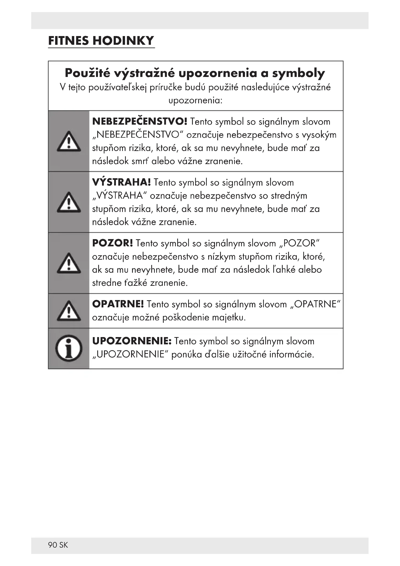 Další nastavení: V aplikaci se zobrazí přehled Dnes. Klikněte na Nastavení a poté na Můj profil. Dále budete vyzváni k zadání osobních údajů: Pohlaví, datum narození, hmotnost, výška. Na nastavení, které chcete změnit, klepněte. Pro potvrzení stiskněte tlačítko vpravo nahoře Uložit. Poté budete požádáni, povolit oznamování. Vyberte aplikaci, jejíž vyrozumění chcete rovněž zobrazovat na dotykovém displeji[1] výrobku. Stlačte na Uložit. Pokud mají další dotazy proběhnout na vašem mobilním zařízení (například „Povolit sledovač“ nebo „Předávat zprávy“) (v závislosti na modelu vašeho mobilu): Potvrďte tyto dotazy.88 CZ V závislosti na modelu vašeho mobilního zařízení se může stát, že jste pro aplikaci SilverCrest Smart Watch museli vypnout režim úsporného napájení, aby aplikace mohla i nadále běžet na pozadí. Více informací najdete v kapitole Časté dotazy aplikace. Další informace: V nabídce aplikace zvolte kartu Nastavení a klepněte na Uživatelský manuál. Odstranění do odpadu Balení: Obal se skládá z ekologických materiálů, které můžete zlikvidovat prostřednictvím místních sběren recyklovatelných materiálů. Výrobek: Informujte se o možnostech likvidace vysloužilého výrobku u správy Vaší obce nebo města. Vedle uvedený symbol přeškrtnuté odpadní nádoby na kolečkách značí, že pro výrobek platí směrnice 2012/19/EU. Tato směrnice stanovuje, že se přístroj nesmí odstraňovat do normálního domácího odpadu, ale do zvláštních, speciálně založených sběren, sběren zužitkovatelných materiálů nebo speciálních provozů. Toto odstranění do odpadu je pro Vás bezplatné. Chraňte životní prostředí a odstraňujte do odpadu odborně. Výrobek je recyklovatelný, podléhá rozšířené zodpovědnosti výrobce a likviduje se odděleně. Zjednodušené EU prohlášení o shodě Tímto společnost OWIM GmbH & Co. KG, Stiftsbergstraße1, 74167 Neckarsulm, NĚMECKO prohlašuje, že výrobek FITNESS CHYTRÉ HODINKY HG06266, odpovídá směrnicím 2014/53/EU a 2011/65/EU. Úplný text EU prohlášení o shodě najdete na následující internetové adrese: www.owim.com89SK Použité výstražné upozornenia a symboly ..... Strana 90 Použitie v súlade s určením .................... Strana 91 Bezpečnostné upozornenia .................... Strana 92 Bezpečnostné upozornenia pre nabíjateľné batérie ... Strana 94 Popis častí..................................... Strana 97 Technické údaje . . . . . . . . . . . . . . . . . . . . . . . . . . . . . . . Strana 98 Nabíjanie batérie.............................. Strana 99 Inštalácia aplikácie ............................ Strana 100 Párovanie produktu a mobilného zariadenia ... Strana 100 Likvidácia ..................................... Strana 102 Zjednodušené EÚ vyhlásenie o zhode .......... Strana 10290 SK FITNES HODINKY Použité výstražné upozornenia a symboly V tejto používateľskej príručke budú použité nasledujúce výstražné upozornenia: NEBEZPEČENSTVO! Tento symbol so signálnym slovom „NEBEZPEČENSTVO“ označuje nebezpečenstvo s vysokým stupňom rizika, ktoré, ak sa mu nevyhnete, bude mať za následok smrť alebo vážne zranenie. VÝSTRAHA! Tento symbol so signálnym slovom „VÝSTRAHA“ označuje nebezpečenstvo so stredným stupňom rizika, ktoré, ak sa mu nevyhnete, bude mať za následok vážne zranenie. POZOR! Tento symbol so signálnym slovom „POZOR“ označuje nebezpečenstvo s nízkym stupňom rizika, ktoré, ak sa mu nevyhnete, bude mať za následok ľahké alebo stredne ťažké zranenie. OPATRNE! Tento symbol so signálnym slovom „OPATRNE“ označuje možné poškodenie majetku. UPOZORNENIE: Tento symbol so signálnym slovom „UPOZORNENIE“ ponúka ďalšie užitočné informácie.91SK VÝSTRAHA! NEBEZPEČENSTVO VÝBUCHU! Výstraha, ktorá je označená týmto symbolom a slovom „VÝSTRAHA! NEBEZPEČENSTVO VÝBUCHU!“, upozorňuje na nebezpečenstvo výbuchu. Ak sa takéto výstražné upozornenie neuposlúchne, môže to mať za následok ťažké zranenia alebo smrť a môže to spôsobiť škody. Dodržiavajte pokyny v tejto výstrahe, aby sa zabránilo ťažkým zraneniam, ohrozeniu života alebo nebezpečenstvu vzniku vecných škôd! Táto príkazová značka poukazuje na nosenie vhodných ochranných rukavíc! Postupujte podľa pokynov uvedených v tomto upozornení, aby ste predišli zraneniam rúk rôznymi predmetmi alebo kontaktom s horúcimi, alebo chemickými materiálmi. Tento symbol znamená, že pred použitím produktu je potrebné prečítať si návod na obsluhu. Použitie v súlade s určením Tento produkt spadá do kategórie informačná elektronika. Všetky jeho funkcie môžete využiť po pripojení produktu k mobilnému zariadeniu. Produkt zaznamenáva kroky, kilometre, spálené kalórie, trvanie aktivít a dĺžku spánku. Produkt je vhodný na použitie s nasledujúcimi systémami: iOS od verzie 8.0, Android ™ verzie 6.0 alebo vyššia, Bluetooth V 4.2. Produkt je určený iba na súkromné použitie, nie je povolené komerčné použitie.92 SK Bezpečnostné upozornenia PRED POUŽITÍM PRODUKTU SA OBOZNÁMTE SO VŠETKÝMI BEZPEČNOSTNÝMI UPOZORNENIAMI A POKYNMI NA POUŽITIE! KEĎ BUDETE TENTO PRODUKT ODOVZDÁVAŤ ĎALEJ, ODOVZDAJTE VŽDY AJ KOMPLETNÚ DOKUMENTÁCIU! V prípade poškodenia z dôvodu nedodržania tohto návodu na obsluhu zaniká nárok na záruku! Za následne vzniknuté škody nepreberáme žiadnu záruku! V prípade majetkových alebo personálnych škôd z dôvodu neodborného používania alebo nedodržania bezpečnostných upozornení nepreberáme žiadnu zodpovednosť! Pred každým použitím: Skontrolujte produkt, či nie je poškodený. Nepoužívajte poškodený produkt. Tento produkt môžu používať deti od 8rokov a staršie, ako aj osoby so zníženými fyzickým
