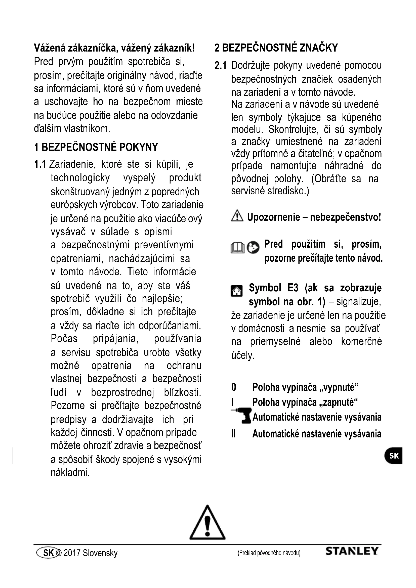 Dodržujte pokyny uvedené pomocou bezpečnostných značiek osadených na zariadení a v tomto návode. Na zariadení a v návode sú uvedené len symboly týkajúce sa kúpeného modelu. Skontrolujte, či sú symboly a značky umiestnené na zariadení vždy prítomné a čitateľné; v opačnom prípade namontujte náhradné do pôvodnej polohy. (Obráťte sa na servisné stredisko.) Upozornenie – nebezpečenstvo! Pred použitím si, prosím, pozorne prečítajte tento návod. Symbol E3 (ak sa zobrazuje symbol na obr. 1) – signalizuje, že zariadenie je určené len na použitie v domácnosti a nesmie sa používať na priemyselné alebo komerčné účely.