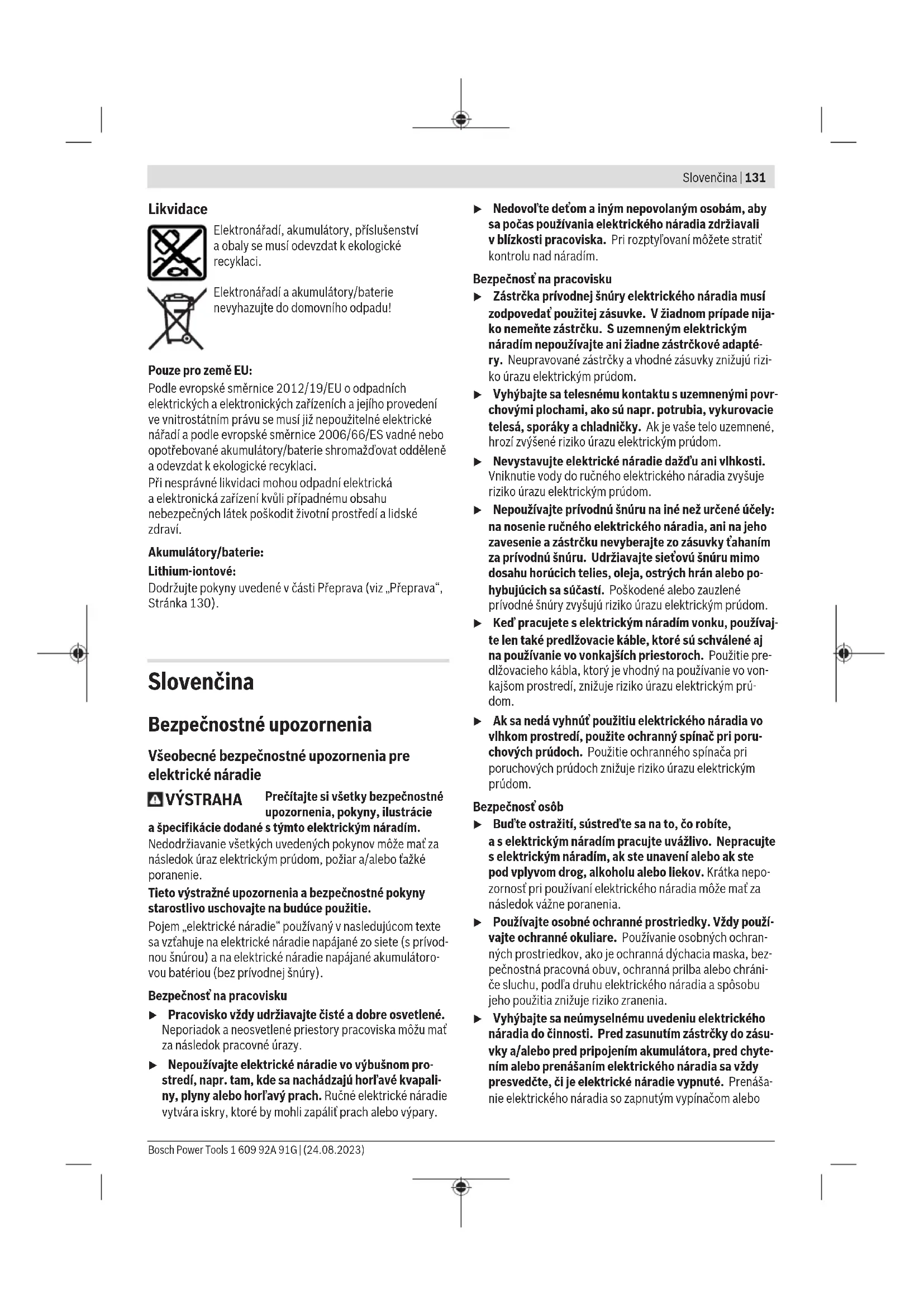 Low Energy Module GCY42 (příslušenství) je vybavené bezdrátovým rozhraním. Je nutné dodržovat místní omezení provozu, např. vletadlech nebo nemocnicích. u Elektronářadí nasazujte na šroub pouze vypnuté. Otáčející se nástroje mohou sklouznout. Spona na pásek Pomocí spony na pásek (6) můžete elektronářadí zavěsit např. na pásek. Pak máte obě ruce volné aelektronářadí je kdykoli po ruce. Údržba aservis Údržba ačištění u Před každou prací na elektronářadí (např. údržba, výměna nástrojů) apři jeho přepravě auskladnění vyjměte akumulátor. Při neúmyslném stisknutí vypínače hrozí nebezpečí poranění. u Udržujte elektronářadí avětrací otvory čisté, aby pracovalo dobře abezpečně. Zákaznická služba aporadenství ohledně použití Zákaznická služba zodpoví vaše dotazy kopravě aúdržbě vašeho výrobku atéž knáhradním dílům. Rozkladové výkresy ainformace onáhradních dílech najdete také na: www.bosch-pt.com Vpřípadě dotazů knašim výrobkům apříslušenství vám ochotně pomůže poradenský tým Bosch. Vpřípadě veškerých otázek aobjednávek náhradních dílů bezpodmínečně uveďte 10místné věcné číslo podle typového štítku výrobku. Czech Republic Robert Bosch odbytová s.r.o. Bosch Service Center PT K Vápence 1621/16 692 01 Mikulov Na www.bosch-pt.cz si si můžete objednat opravu Vašeho stroje nebo náhradní díly online. Tel.: +420 519 305700 Fax: +420 519 305705 E-Mail: servis.naradi@cz.bosch.com www.bosch-pt.cz Další adresy servisů najdete na: www.bosch-pt.com/serviceaddresses Přeprava Doporučené lithium-iontové akumulátory podléhají požadavkům zákona onebezpečných nákladech. Tyto akumulátory mohou být bez dalších podmínek přepravovány uživatelem po silnici. Při zasílání prostřednictvím třetí osoby (např.: letecká přeprava nebo spedice) je třeba brát zřetel na zvláštní požadavky na balení aoznačení. Zde musí být při přípravě zásilky nezbytně přizván expert na nebezpečné náklady. Akumulátory zasílejte pouze tehdy, pokud není poškozený kryt. Otevřené kontakty přelepte lepicí páskou aakumulátor zabalte tak, aby se vobalu nemohl pohybovat. Dodržujte také případné další národní předpisy. 1 609 92A 91G | (24.08.2023) Bosch Power ToolsSlovenčina | 131 Likvidace Elektronářadí, akumulátory, příslušenství aobaly se musí odevzdat kekologické recyklaci. Elektronářadí aakumulátory/baterie nevyhazujte do domovního odpadu! Pouze pro zeměEU: Podle evropské směrnice 2012/19/EU oodpadních elektrických aelektronických zařízeních ajejího provedení ve vnitrostátním právu se musí již nepoužitelné elektrické nářadí apodle evropské směrnice 2006/66/ES vadné nebo opotřebované akumulátory/baterie shromažďovat odděleně aodevzdat kekologické recyklaci. Při nesprávné likvidaci mohou odpadní elektrická aelektronická zařízení kvůli případnému obsahu nebezpečných látek poškodit životní prostředí alidské zdraví. Akumulátory/baterie: Lithium-iontové: Dodržujte pokyny uvedené včásti Přeprava (viz „Přeprava“, Stránka130). Slovenčina Bezpečnostné upozornenia Všeobecné bezpečnostné upozornenia pre elektrické náradie VÝSTRAHA Prečítajte si všetky bezpečnostné upozornenia, pokyny, ilustrácie ašpecifikácie dodané stýmto elektrickým náradím. Nedodržiavanie všetkých uvedených pokynov môže mať za následok úraz elektrickým prúdom, požiar a/alebo ťažké poranenie. Tieto výstražné upozornenia abezpečnostné pokyny starostlivo uschovajte na budúce použitie. Pojem „elektrické náradie“ používaný vnasledujúcom texte sa vzťahuje na elektrické náradie napájané zo siete (sprívod- nou šnúrou) ana elektrické náradie napájané akumulátoro- vou batériou (bez prívodnej šnúry). Bezpečnosť na pracovisku u Pracovisko vždy udržiavajte čisté adobre osvetlené. Neporiadok aneosvetlené priestory pracoviska môžu mať za následok pracovné úrazy. u Nepoužívajte elektrické náradie vo výbušnom pro- stredí, napr. tam, kde sa nachádzajú horľavé kvapali- ny, plyny alebo horľavý prach. Ručné elektrické náradie vytvára iskry, ktoré by mohli zapáliť prach alebo výpary. u Nedovoľte deťom ainým nepovolaným osobám, aby sa počas používania elektrického náradia zdržiavali vblízkosti pracoviska. Pri rozptyľovaní môžete stratiť kontrolu nad náradím. Bezpečnosť na pracovisku u Zástrčka prívodnej šnúry elektrického náradia musí zodpovedať použitej zásuvke. Vžiadnom prípade nija- ko nemeňte zástrčku. Suzemneným elektrickým náradím nepoužívajte ani žiadne zástrčkové adapté- ry. Neupravované zástrčky avhodné zásuvky znižujú rizi- ko úrazu elektrickým prúdom. u Vyhýbajte sa telesnému kontaktu suzemnenými povr- chovými plochami, ako sú napr. potrubia, vykurovacie telesá, sporáky achladničky. Ak je vaše telo uzemnené, hrozí zvýšené riziko úrazu elektrickým prúdom. u Nevystavujte elektrické náradie dažďu ani vlhkosti. Vniknutie vody do ručného elektrického náradia zvyšuje riziko úrazu elektrickým prúdom. u Nepoužívajte prívodnú šnúru na iné než určené účely: na nosenie ručného elektrického náradia, ani na jeho zavesenie azástrčku nevyberajte zo zásuvky ťahaním za prívodnú šnúru. Udržiavajte sieťovú šnúru mimo dosahu horúcich telies, oleja, ostrých hrán alebo po- hybujúcich sa súčastí. Poškodené alebo zauzlené prívodné šnúry zvyšujú riziko úrazu elektrickým prúdom. u Keď pracujete selektrickým náradím vonku, používaj- te len také predlžovacie káble, ktoré sú schválené aj na používanie vo vonkajších priestoroch. Použitie pre- dlžovacieho kábla, ktorý je vhodný na používanie vo von- kajšom prostredí, znižuje riziko úrazu elek
