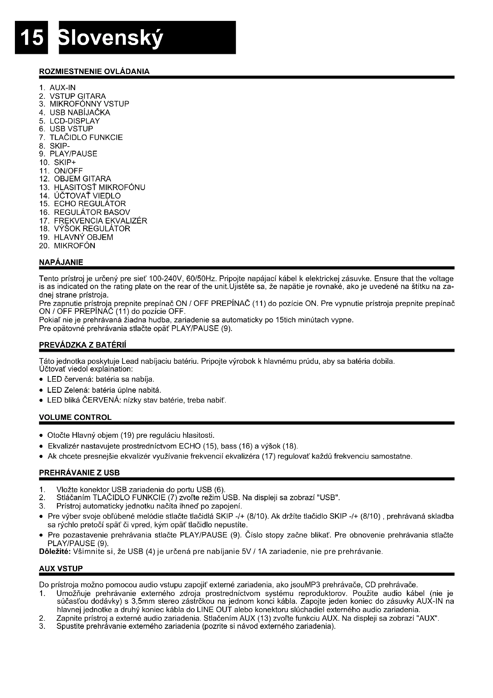 Táto jednotka poskytuje Lead nabíjaciu batériu. Pripojte výrobok k hlavnému prúdu, aby sa batéria dobila. Účtovať viedol explaination: LED červená: batéria sa nabíja. LED Zelená: batéria úplne nabitá. LED bliká ČERVENÁ: nízky stav batérie, treba nabiť. VOLUME CONTROL Otočte Hlavný objem (19) pre reguláciu hlasitosti. Ekvalizér nastavujete prostredníctvom ECHO (15), bass (16) a výšok (18). Ak chcete presnejšie ekvalizér využívanie frekvencií ekvalizéra (17) regulovať každú frekvenciu samostatne.