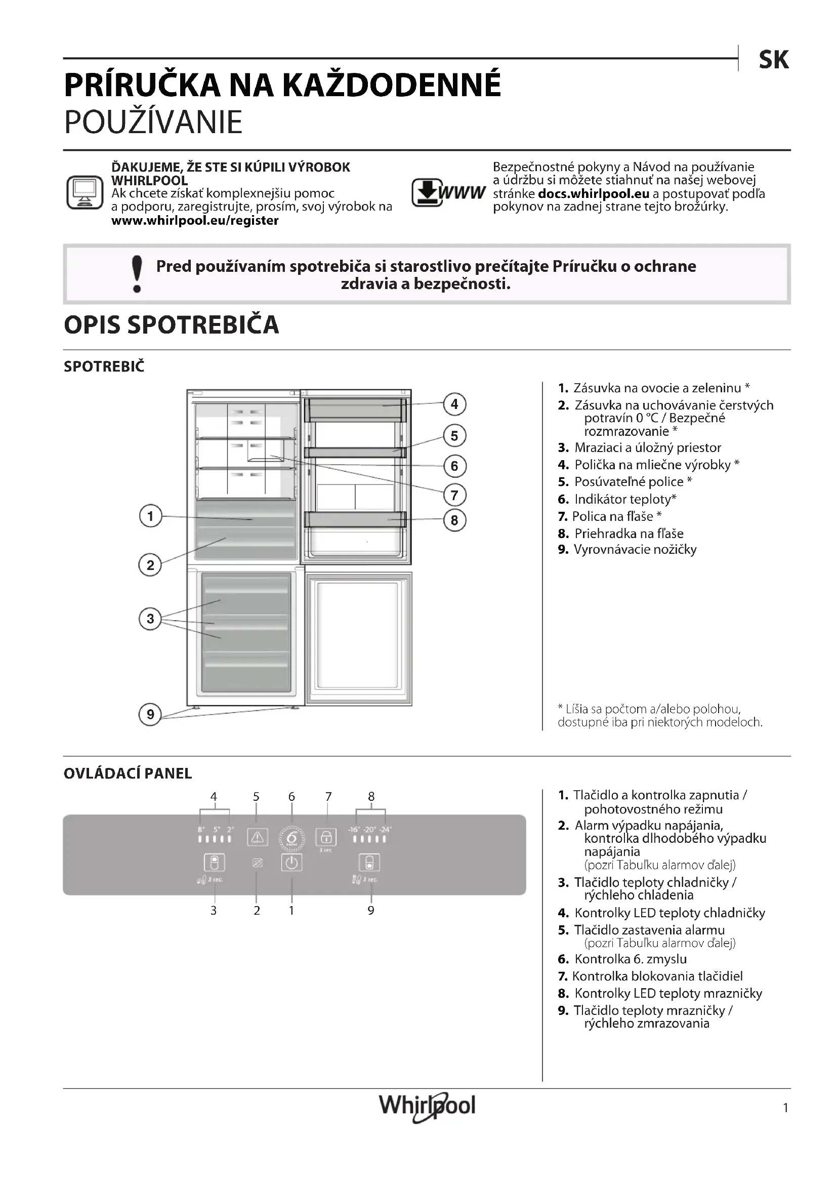 POUŽÍVANIE Pred používaním spotrebiča si starostlivo prečítajte Príručku o ochrane zdravia a bezpečnosti. ĎAKUJEME, ŽE STE SI KÚPILI VÝROBOK WHIRLPOOLAk chcete získať komplexnejšiu pomoc a podporu, zaregistrujte, prosím, svoj výrobok na www . whirlpool . eu / register WWW Bezpečnostné pokyny a Návod na používanie a údržbu si môžete stiahnuť na našej webovej stránke docs.whirlpool.eu a postupovať podľa pokynov na zadnej strane tejto brožúrky. SPOTREBIČ