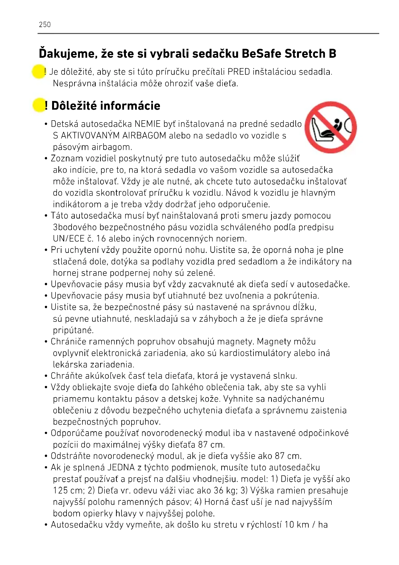 - Autosedačku vždy vymeňte, ak došlo ku stretu v rýchlostí 10 km / ha ! Je dôležité, aby ste si túto príručku prečítali PRED inštaláciou sedadla. Nesprávna inštalácia môže ohroziť vaše dieťa. Ďakujeme, že ste si vybrali sedačku BeSafe Stretch B251 a vyšší, alebo ak existuje podozrenie, že bola z akéhokoľvek dôvodu poškodená. Aj keď môže vypadať nepoškodene, v prípade ďalšej nehody, nemusí byť autosedačka schopná chrániť vaše dieťa na takej úrovni, na ktorú bola navrhnutá.