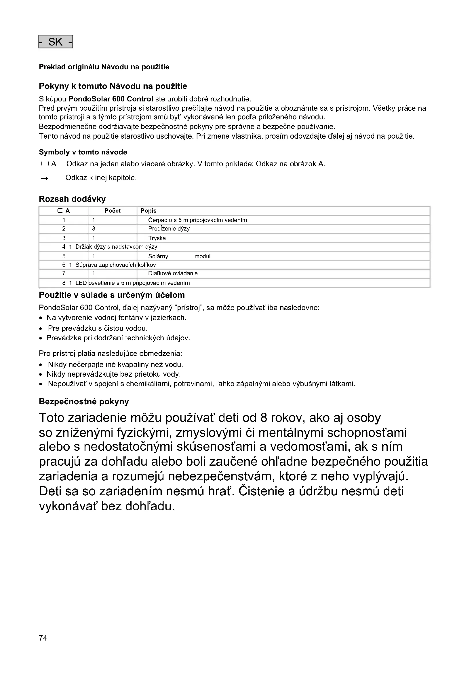 Použitie v súlade s určeným účelom PondoSolar 600 Control, ďalej nazývaný ”prístroj”, sa môže používať iba nasledovne: Na vytvorenie vodnej fontány v jazierkach. Pre prevádzku s čistou vodou. Prevádzka pri dodržaní technických údajov.
