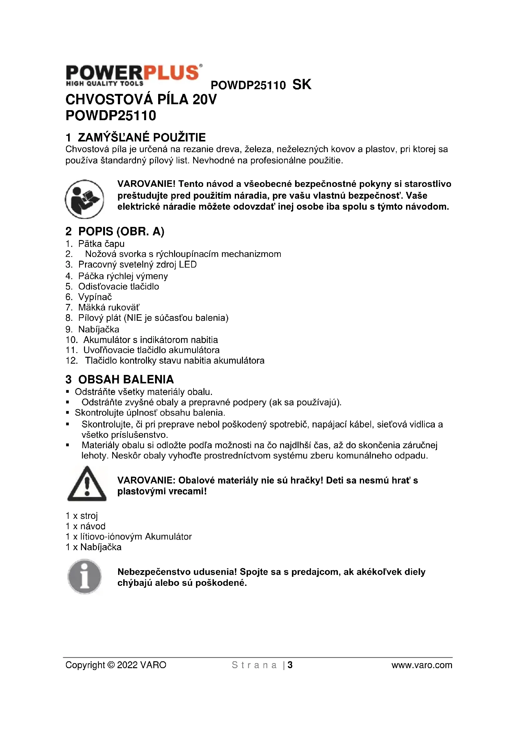 - Ak nečistoty neschádzajú, použite mäkkú handričku namočenú vo vode so saponátom. Nepoužívajte rozpúšťadlá, napr. benzín, alkohol, čpavok atď. Tieto rozpúšťadlá môžu poškodiť plastové diely.POWDP25110 SK Copyright © 2022 VARO S t r a n a | 11 www.varo.com 13 TECHNICKÉ ÚDAJE Č. modelu POWDP25110 Počet kmitov 0 až 2800 min .-1 Menovité napätie 20V Pripojenie akumulátora Zosunutie Rezná hĺbka v oceli 10mm Rezná hĺbka v dreve 120 mm Nastaviteľná päťka čapu Áno Rýchla výmena pílového listu Áno Mäkká rukoväť Áno Mäkká rukoväť Áno Svetelný zdroj LED Áno Vratný zdvih 28mm 14 HLUK Hodnoty emisií hluku namerané podľa príslušnej normy. (K=3) Hladina akustického tlaku LpA 78dB(A) Hladina akustického výkonu LwA 89dB(A) POZOR! Ak akustický tlak prekročí úroveň 85 dB(A), používajte chrániče sluchu. aw (Vibrácie): 10.8m/s² K = 1,5 m/s² 15 ZÁRUKA