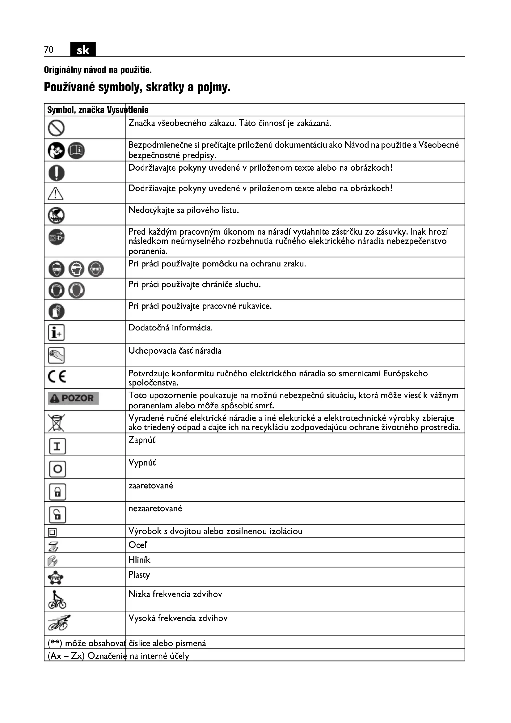 Originálny návod na použitie. Používané symboly, skratky a pojmy. Symbol, značka Vysvetlenie Značka všeobecného zákazu. Táto činnosť je zakázaná. Bezpodmienečne si prečítajte priloženú dokumentáciu ako Návod na použitie a Všeobecné bezpečnostné predpisy. Dodržiavajte pokyny uvedené v priloženom texte alebo na obrázkoch! Dodržiavajte pokyny uvedené v priloženom texte alebo na obrázkoch! Nedotýkajte sa pílového listu. Pred každým pracovným úkonom na náradí vytiahnite zástrčku zo zásuvky. Inak hrozí následkom neúmyselného rozbehnutia ručného elektrického náradia nebezpečenstvo poranenia. Pri práci používajte pomôcku na ochranu zraku. Pri práci používajte chrániče sluchu. Pri práci používajte pracovné rukavice. Dodatočná informácia. Uchopovacia časť náradia Potvrdzuje konformitu ručného elektrického náradia so smernicami Európskeho spoločenstva. Toto upozornenie poukazuje na možnú nebezpečnú situáciu, ktorá môže viesť k vážnym poraneniam alebo môže spôsobiť smrť. Vyradené ručné elektrické náradie a iné elektrické a elektrotechnické výrobky zbierajte ako triedený odpad a dajte ich na recykláciu zodpovedajúcu ochrane životného prostredia. Zapnúť Vypnúť zaaretované nezaaretované Výrobok s dvojitou alebo zosilnenou izoláciou Oceľ Hliník Plasty Nízka frekvencia zdvihov Vysoká frekvencia zdvihov (**) môže obsahovať číslice alebo písmená (Ax – Zx) Označenie na interné účely OBJ_BUCH-0000000078-004.book Page 70 Wednesday, February 26, 2020 1:28 PM71