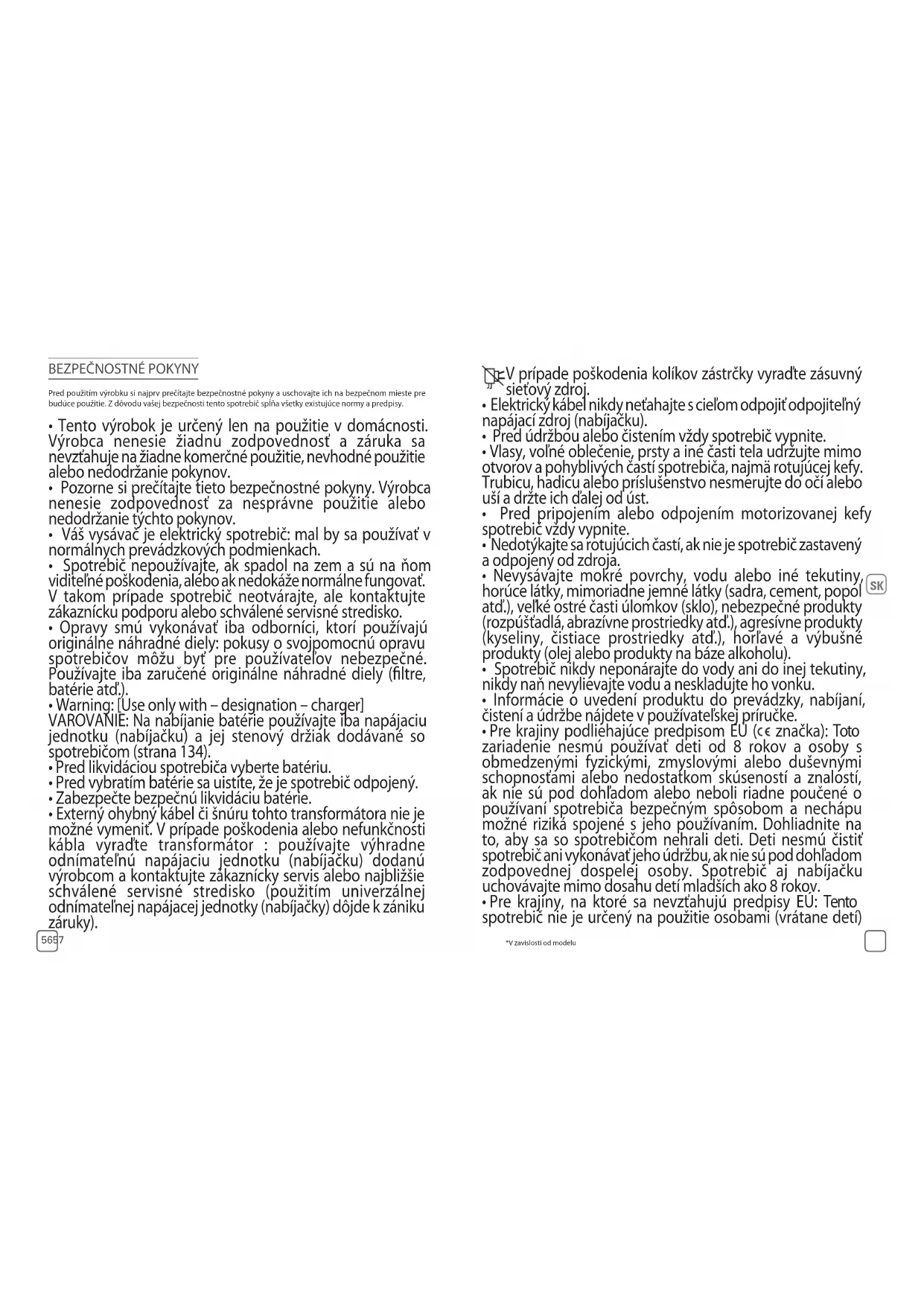 - VAROVANIE – Batéria použitá v tomto spotrebiči môže pri nesprávnom použití predstavovať riziko požiaru alebo chemického popálenia. Nesmie sa rozoberať, skratovať, skladovať pri < 0 °C a > 45 °C ani spáliť. Uchovávajte mimo dosahu detí. Nerozoberajte ju a nehádžte do ohňa.