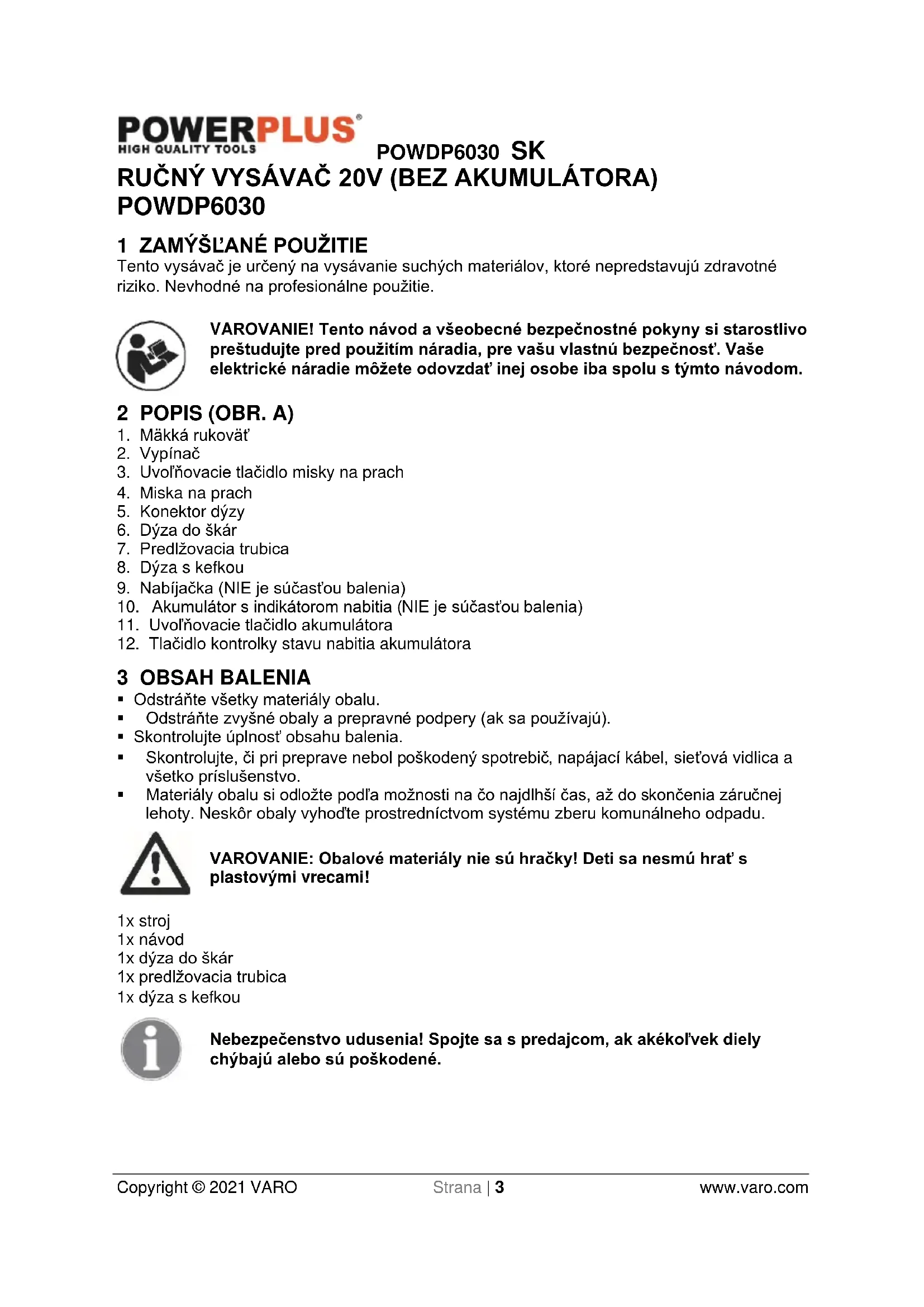 - Vždy skontrolujte, či napätie napájacieho zdroja súhlasí s napätím na výkonnostnom štítku.POWDP6030 SK Copyright © 2021 VARO Strana | 5 www.varo.com