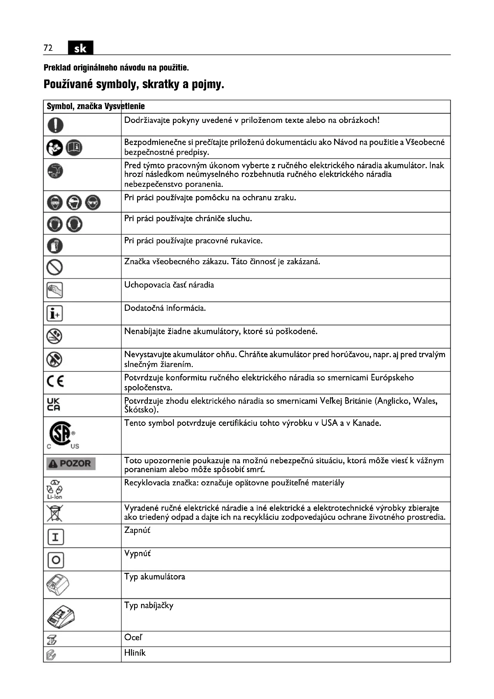 Preklad originálneho návodu na použitie. Používané symboly, skratky a pojmy. Symbol, značka Vysvetlenie Dodržiavajte pokyny uvedené v priloženom texte alebo na obrázkoch! Bezpodmienečne si prečítajte priloženú dokumentáciu ako Návod na použitie a Všeobecné bezpečnostné predpisy. Pred týmto pracovným úkonom vyberte z ručného elektrického náradia akumulátor. Inak hrozí následkom neúmyselného rozbehnutia ručného elektrického náradia nebezpečenstvo poranenia. Pri práci používajte pomôcku na ochranu zraku. Pri práci používajte chrániče sluchu. Pri práci používajte pracovné rukavice. Značka všeobecného zákazu. Táto činnosť je zakázaná. Uchopovacia časť náradia Dodatočná informácia. Nenabíjajte žiadne akumulátory, ktoré sú poškodené. Nevystavujte akumulátor ohňu. Chráňte akumulátor pred horúčavou, napr. aj pred trvalým slnečným žiarením. Potvrdzuje konformitu ručného elektrického náradia so smernicami Európskeho spoločenstva. Potvrdzuje zhodu elektrického náradia so smernicami Veľkej Británie (Anglicko, Wales, Škótsko). Tento symbol potvrdzuje certifikáciu tohto výrobku v USA a v Kanade. Toto upozornenie poukazuje na možnú nebezpečnú situáciu, ktorá môže viesť k vážnym poraneniam alebo môže spôsobiť smrť. Recyklovacia značka: označuje opätovne použiteľné materiály Vyradené ručné elektrické náradie a iné elektrické a elektrotechnické výrobky zbierajte ako triedený odpad a dajte ich na recykláciu zodpovedajúcu ochrane životného prostredia. Zapnúť Vypnúť Typ akumulátora Typ nabíjačky Oceľ Hliník73