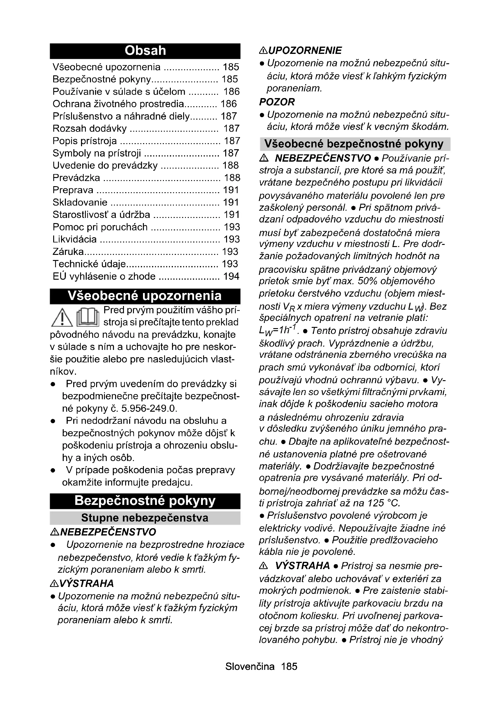 Délka kabelu m 10Slovenčina 185 Obsah Všeobecné upozornenia Pred prvým použitím vášho prí- stroja si prečítajte tento preklad pôvodného návodu na prevádzku, konajte v súlade s ním a uchovajte ho pre neskor- šie použitie alebo pre nasledujúcich vlast- níkov. ● Pred prvým uvedením do prevádzky si bezpodmienečne prečítajte bezpečnost- né pokyny č. 5.956-249.0. ● Pri nedodržaní návodu na obsluhu a bezpečnostných pokynov môže dôjsť k poškodeniu prístroja a ohrozeniu obslu- hy a iných osôb. ● V prípade poškodenia počas prepravy okamžite informujte predajcu. Bezpečnostné pokyny Stupne nebezpečenstva NEBEZPEČENSTVO ● Upozornenie na bezprostredne hroziace nebezpečenstvo, ktoré vedie k ťažkým fy- zickým poraneniam alebo k smrti. 몇 VÝSTRAHA ● Upozornenie na možnú nebezpečnú situ- áciu, ktorá môže viesť k ťažkým fyzickým poraneniam alebo k smrti. 몇 UPOZORNENIE ● Upozornenie na možnú nebezpečnú situ- áciu, ktorá môže viesť k ľahkým fyzickým poraneniam. POZOR ● Upozornenie na možnú nebezpečnú situ- áciu, ktorá môže viesť k vecným škodám. Všeobecné bezpečnostné pokyny NEBEZPEČENSTVO ● Používanie prí- stroja a substancií, pre ktoré sa má použiť, vrátane bezpečného postupu pri likvidácii povysávaného materiálu povolené len pre zaškolený personál. ● Pri spätnom privá- dzaní odpadového vzduchu do miestnosti musí byť zabezpečená dostatočná miera výmeny vzduchu v miestnosti L. Pre dodr- žanie požadovaných limitných hodnôt na pracovisku spätne privádzaný objemový prietok smie byť max. 50% objemového prietoku čerstvého vzduchu (objem miest- nosti V