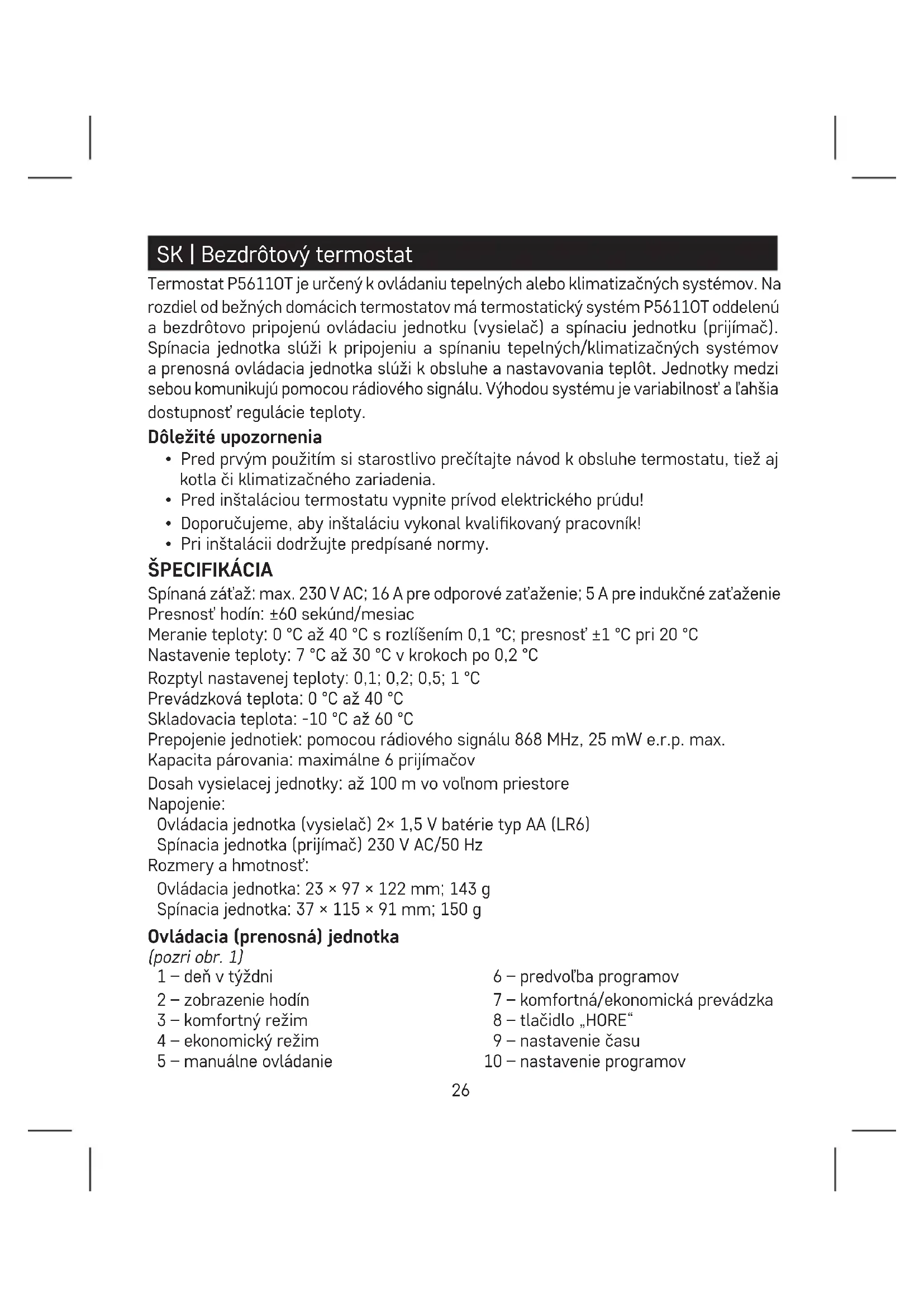 - Pri inštalácii dodržujte predpísané normy. ŠPECIFIKÁCIA Spínaná záťaž: max. 230 V AC; 16 A pre odporové zaťaženie; 5 A pre indukčné zaťaženie Presnosť hodín: ±60 sekúnd/mesiac Meranie teploty: 0 °C až 40 °C s rozlíšením 0,1 °C; presnosť ±1 °C pri 20 °C Nastavenie teploty: 7 °C až 30 °C v krokoch po 0,2 °C Rozptyl nastavenej teploty: 0,1; 0,2; 0,5; 1 °C Prevádzková teplota: 0 °C až 40 °C Skladovacia teplota: -10 °C až 60 °C Prepojenie jednotiek: pomocou rádiového signálu 868 MHz, 25 mW e.r.p. max. Kapacita párovania: maximálne 6 prijímačov Dosah vysielacej jednotky: až 100 m vo voľnom priestore Napojenie: Ovládacia jednotka (vysielač) 2× 1,5 V batérie typ AA (LR6) Spínacia jednotka (prijímač) 230 V AC/50 Hz Rozmery a hmotnosť: Ovládacia jednotka: 23 × 97 × 122 mm; 143 g Spínacia jednotka: 37 × 115 × 91 mm; 150 g Ovládacia (prenosná) jednotka (pozri obr. 1) 1 – deň v týždni 2 – zobrazenie hodín 3 – komfortný režim 4 – ekonomický režim 5 – manuálne ovládanie 6 – predvoľba programov 7 – komfortná/ekonomická prevádzka 8 – tlačidlo „HORE“ 9 – nastavenie času 10 – nastavenie programov27 11 – ikona bezdrôtovej komunikácie 12 – nastavená teplota 13 – indikácia námrazy 14 – ikona prevádzky 15 – indikácia stavu batérií 16 – zobrazenie aktuálnej izbovej teploty 17 – zobrazenie prolu dňa 18 – tlačidlo „DOLU“ 19 – nastavenie teploty 20 – podsvietený displej 21 – RESET prístroja Odobratie zadného krytu ovládacej jednotky (pozri obr. 2)