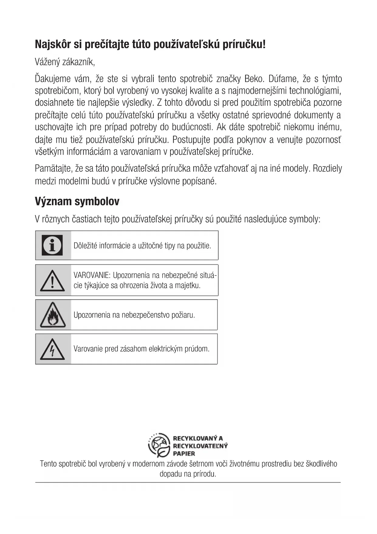Dôležité bezpečnostné pokyny: Dôkladne si ich prečítajte a uscho- vajte pre nahliadnutie v budúcnosti Táto časť obsahuje bezpečnostné pokyny, ktoré pomôžu ochrániť pred zranením osôb, poškodením majetku, vznikom požiaru alebo pred zásahom elektrickým prú- dom. Nedodržanie týchto pokynov zruší platnosť akejkoľvek záruky.