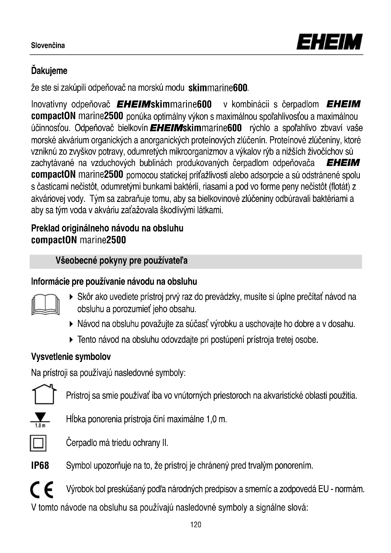 Inovatívny odpeňovač EHEIM skimmarine600 v kombinácii s čerpadlom EHEIM compactON marine2500 ponúka optimálny výkon s maximálnou spoľahlivosťou a maximálnou účinnosťou. Odpeňovač bielkovín EHEIM skimmarine600 rýchlo a spoľahlivo zbvaví vaše morské akvárium organických a anorganických proteínových zlúčenín. Proteínové zlúčeniny, ktoré vzniknú zo zvyškov potravy, odumretých mikroorganizmov a výkalov rýb a nižších živočíchov sú zachytávané na vzduchových bublinách produkovaných čerpadlom odpeňovača EHEIM compactON marine2500 pomocou statickej príťažlivosti alebo adsorpcie a sú odstránené spolu s časticami nečistôt, odumretými bunkami baktérií, riasami a pod vo forme peny nečistôt (flotát) z akváriovej vody. Tým sa zabraňuje tomu, aby sa bielkovinové zlúčeniny odbúravali baktériami a aby sa tým voda v akváriu zaťažovala škodlivými látkami. Slovenčina Všeobecné pokyny pre používateľa Preklad originálneho návodu na obsluhu compactON marine2500