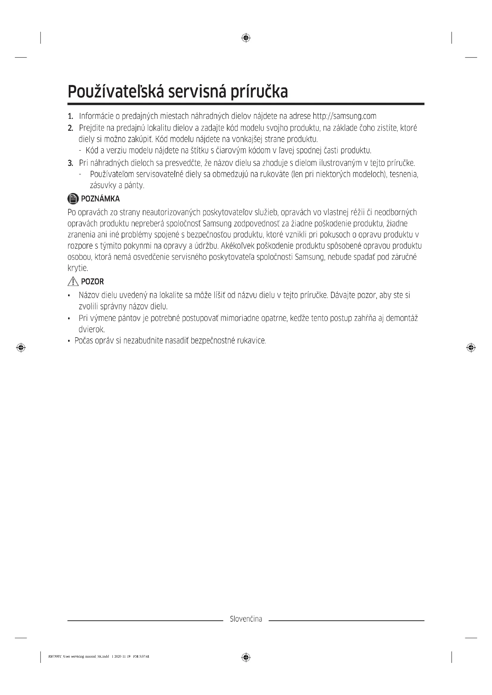 - Používateľom servisovateľné diely sa obmedzujú na rukoväte (len pri niektorých modeloch), tesnenia, zásuvky a pánty. POZNÁMKA Po opravách zo strany neautorizovaných poskytovateľov služieb, opravách vo vlastnej réžii či neodborných opravách produktu nepreberá spoločnosť Samsung zodpovednosť za žiadne poškodenie produktu, žiadne zranenia ani iné problémy spojené s bezpečnosťou produktu, ktoré vznikli pri pokusoch o opravu produktu v rozpore s týmito pokynmi na opravy a údržbu. Akékoľvek poškodenie produktu spôsobené opravou produktu osobou, ktorá nemá osvedčenie servisného poskytovateľa spoločnosti Samsung, nebude spadať pod záručné krytie. POZOR