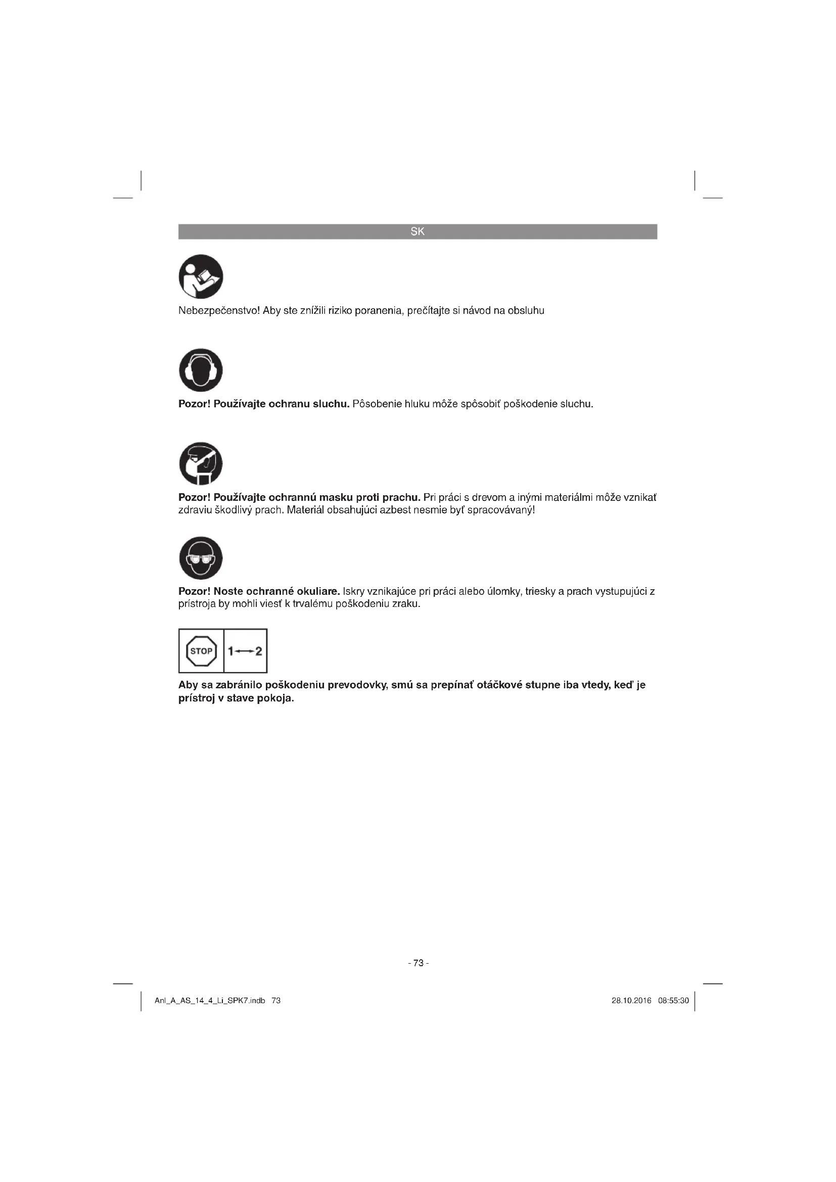 Nebezpečenstvo! Aby ste znížili riziko poranenia, prečítajte si návod na obsluhu Pozor! Používajte ochranu sluchu. Pôsobenie hluku môže spôsobiť poškodenie sluchu. Pozor! Noste ochranné okuliare. Iskry vznikajúce pri práci alebo úlomky, triesky a prach vystupujúci z prístroja by mohli viesť k trvalému poškodeniu zraku. Pozor! Používajte ochrannú masku proti prachu. Pri práci s drevom a inými materiálmi môže vznikať zdraviu škodlivý prach. Materiál obsahujúci azbest nesmie byť spracovávaný! Aby sa zabránilo poškodeniu prevodovky, smú sa prepínať otáčkové stupne iba vtedy, keď je prístroj v stave pokoja. Anl_A_AS_14_4_Li_SPK7.indb 73Anl_A_AS_14_4_Li_SPK7.indb 73 28.10.2016 08:55:3028.10.2016 08:55:30SK