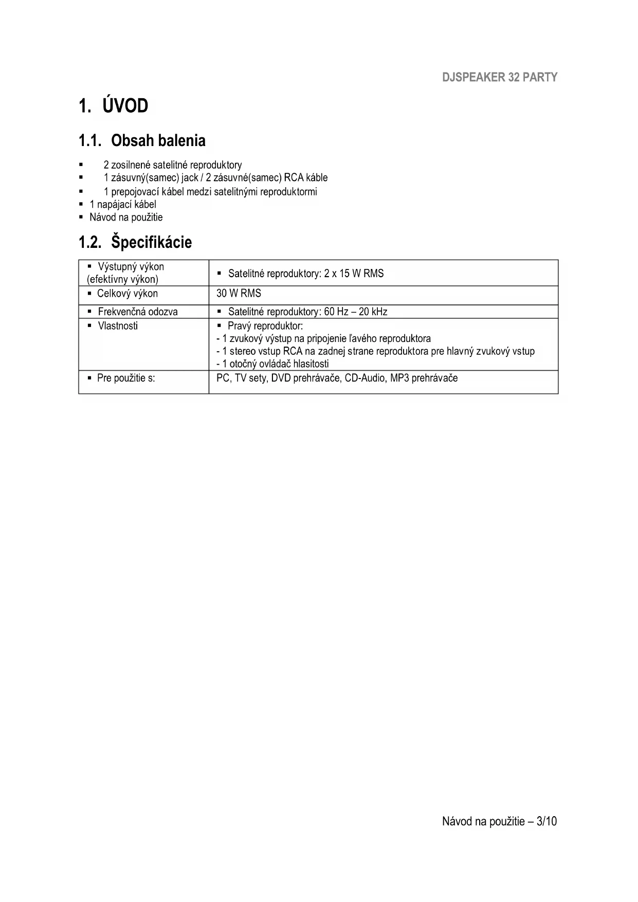 Pre použitie s: PC, TV sety, DVD prehrávače, CD-Audio, MP3 prehrávačeDJSPEAKER 32 PARTY 4/10 – Návod na použitie 1.3. Odporúčania - Satelitné reproduktory umiestnite na rovný povrch, aby ste predišli riziku pádu reproduktorov. - Reproduktory nikdy neotvárajte, pretože riskujete poškodenie ich vnútorných komponentov. - Tieto reproduktory sú určené na použitie v kľudnom prostredí. - Aby ste predišli riziku požiaru alebo elektrického výboja, držte reproduktory mimo: - dažďu alebo vlhkosti, ako aj všetkých tekutín (voda, chemické výrobky alebo akékoľvek iné kvapaliny), - zdrojov tepla, ako sú ohrievače, sporáky alebo akékoľvek iné zariadenia produkujúce teplo (vrátane zosilňovačov), - priameho slnečného svetla. - Nevystavujte reproduktory kvapkajúcej ani striekajúcej vode. - Na reproduktory nikdy neklaďte žiadny predmet naplnený tekutinou (pohár, váza ...). - Ak nechcete reproduktory dlhší čas používať, vypnite ich. Ak chcete odpojiť napájací kábel, uchopte a vytiahnite zástrčku, nikdy neťahajte za kábel. - Uistite sa, že sieťová zástrčka reproduktorovej súpravy pripojená k elektrickej zásuvke zostáva ľahko prístupná. - Pred čistením reproduktory vypnite. Používajte vlhkú handričku a nepoužívajte aerosólové čistiace prostriedky. - Sieťová zástrčka súpravy reproduktorov slúži na vypnutie zariadenia, a preto musí byť vždy ľahko prístupná. - Značky sú umiestnené na zadnej strane reproduktorov.