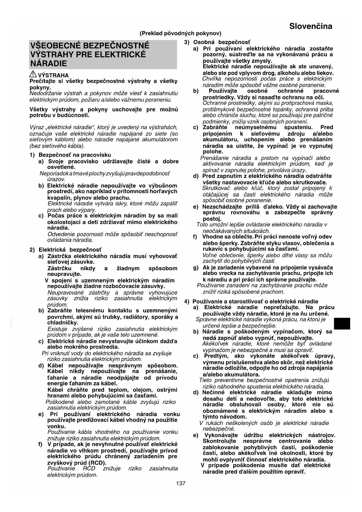 NÁRADIE VÝSTRAHA Prečítajte si všetky bezpečnostné výstrahy a všetky pokyny. Nedodržanie výstrah a pokynov môže viesť k zasiahnutiu elektrickým prúdom, požiaru a/alebo vážnemu poraneniu. Všetky výstrahy a pokyny uschovajte pre možnú potrebu v budúcnosti. Výraz „elektrické náradie“, ktorý je uvedený na výstrahách, označuje vaše elektrické náradie napájané zo siete (so sieťovým káblom) alebo náradie napájané akumulátorom (bez sieťového kábla).