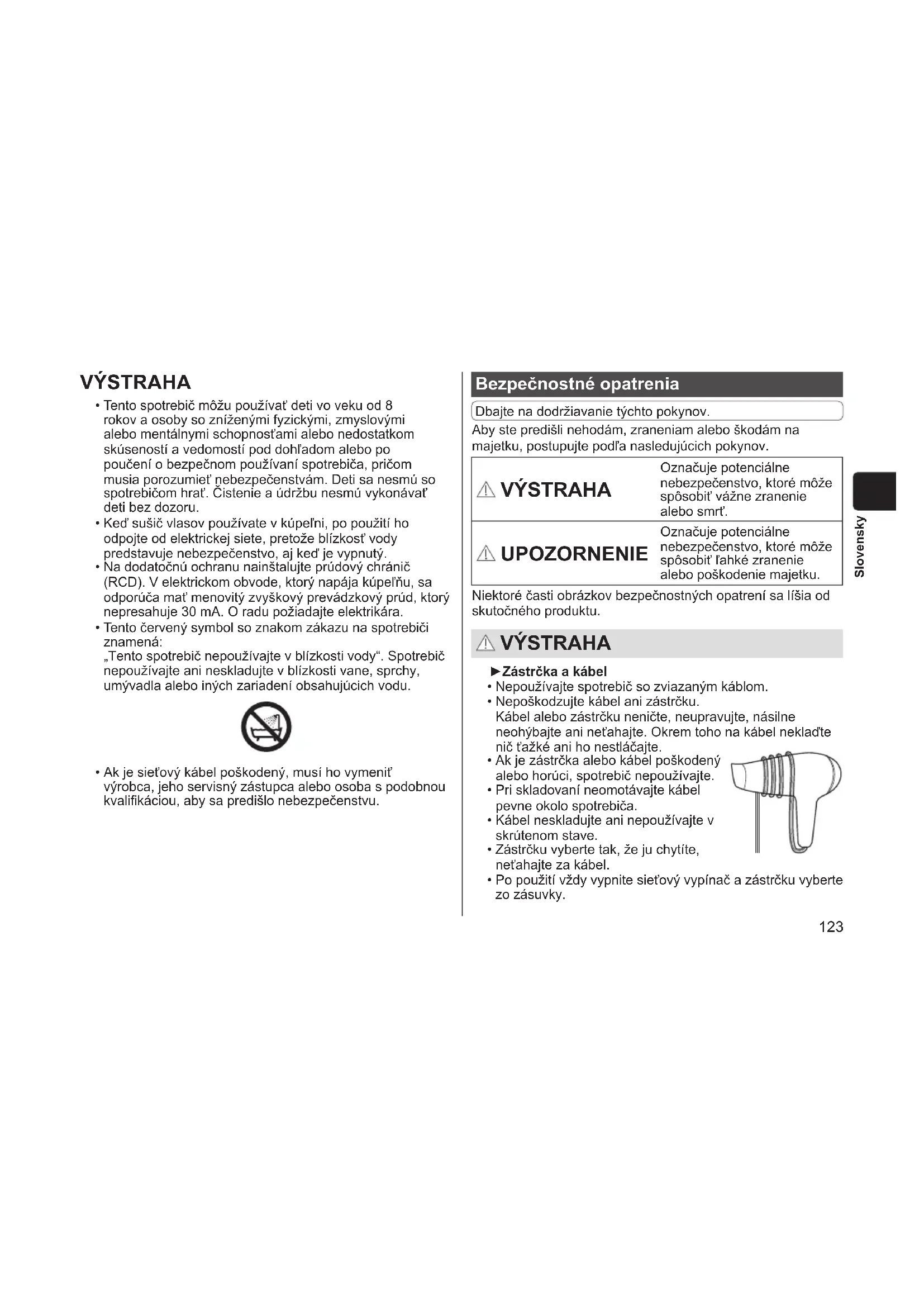 - Ak je sieťový kábel poškodený, musí ho vymeniť výrobca, jeho servisný zástupca alebo osoba s podobnou kvalifikáciou, aby sa predišlo nebezpečenstvu. Bezpečnostné opatrenia Dbajte na dodržiavanie týchto pokynov. Aby ste predišli nehodám, zraneniam alebo škodám na majetku, postupujte podľa nasledujúcich pokynov. VÝSTRAHA Označuje potenciálne nebezpečenstvo, ktoré môže spôsobiť vážne zranenie alebo smrť. UPOZORNENIE Označuje potenciálne nebezpečenstvo, ktoré môže spôsobiť ľahké zranenie alebo poškodenie majetku. Niektoré časti obrázkov bezpečnostných opatrení sa líšia od skutočného produktu. VÝSTRAHA ►Zástrčka a kábel