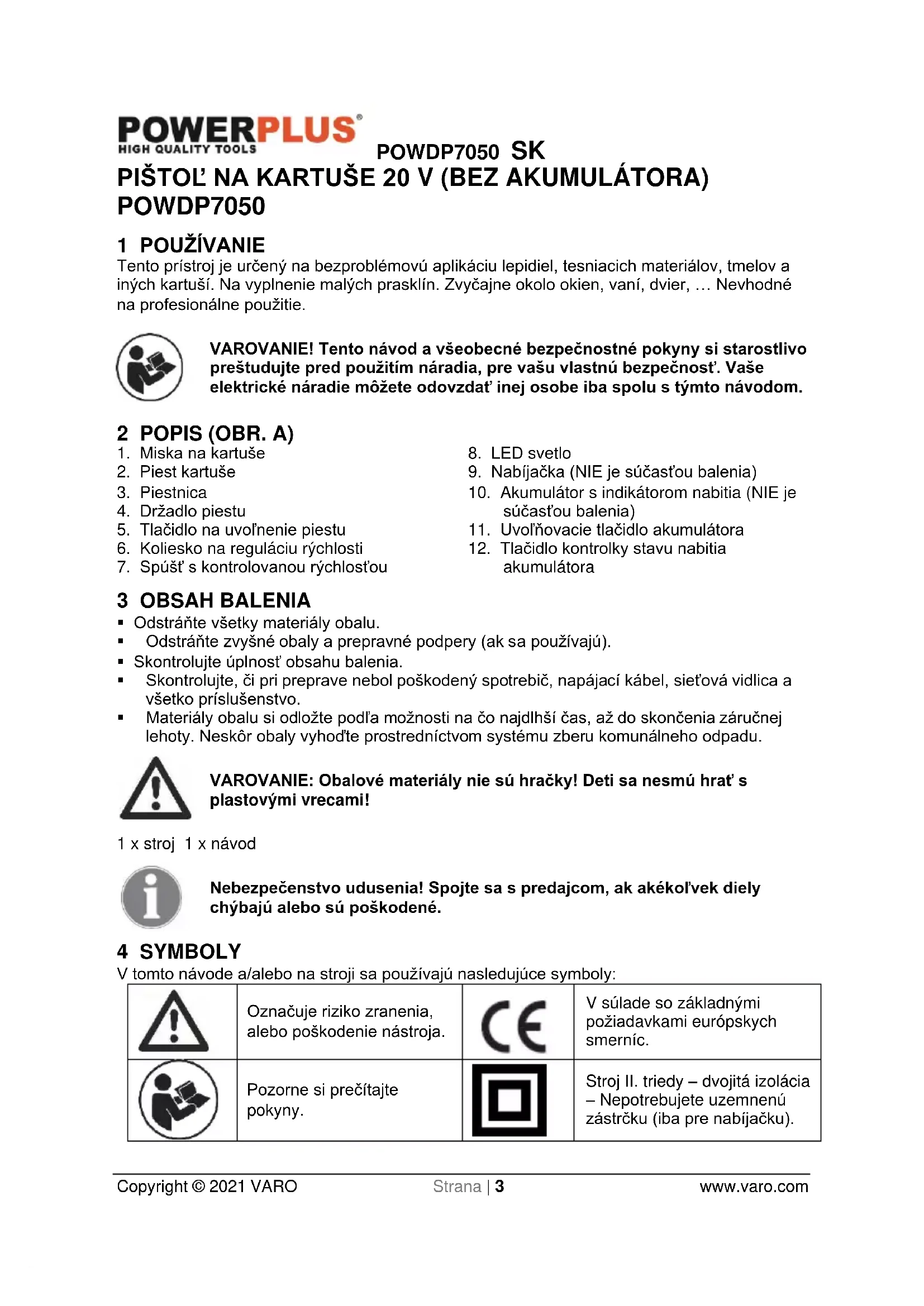 Copyright © 2021 VARO Strana | 3 www.varo.com PIŠTOĽ NA KARTUŠE 20 V (BEZ AKUMULÁTORA) POWDP7050 1 POUŽÍVANIE Tento prístroj je určený na bezproblémovú aplikáciu lepidiel, tesniacich materiálov, tmelov a iných kartuší. Na vyplnenie malých prasklín. Zvyčajne okolo okien, vaní, dvier, … Nevhodné na profesionálne použitie. VAROVANIE! Tento návod a všeobecné bezpečnostné pokyny si starostlivo preštudujte pred použitím náradia, pre vašu vlastnú bezpečnosť. Vaše elektrické náradie môžete odovzdať inej osobe iba spolu s týmto návodom. 2 POPIS (OBR. A)