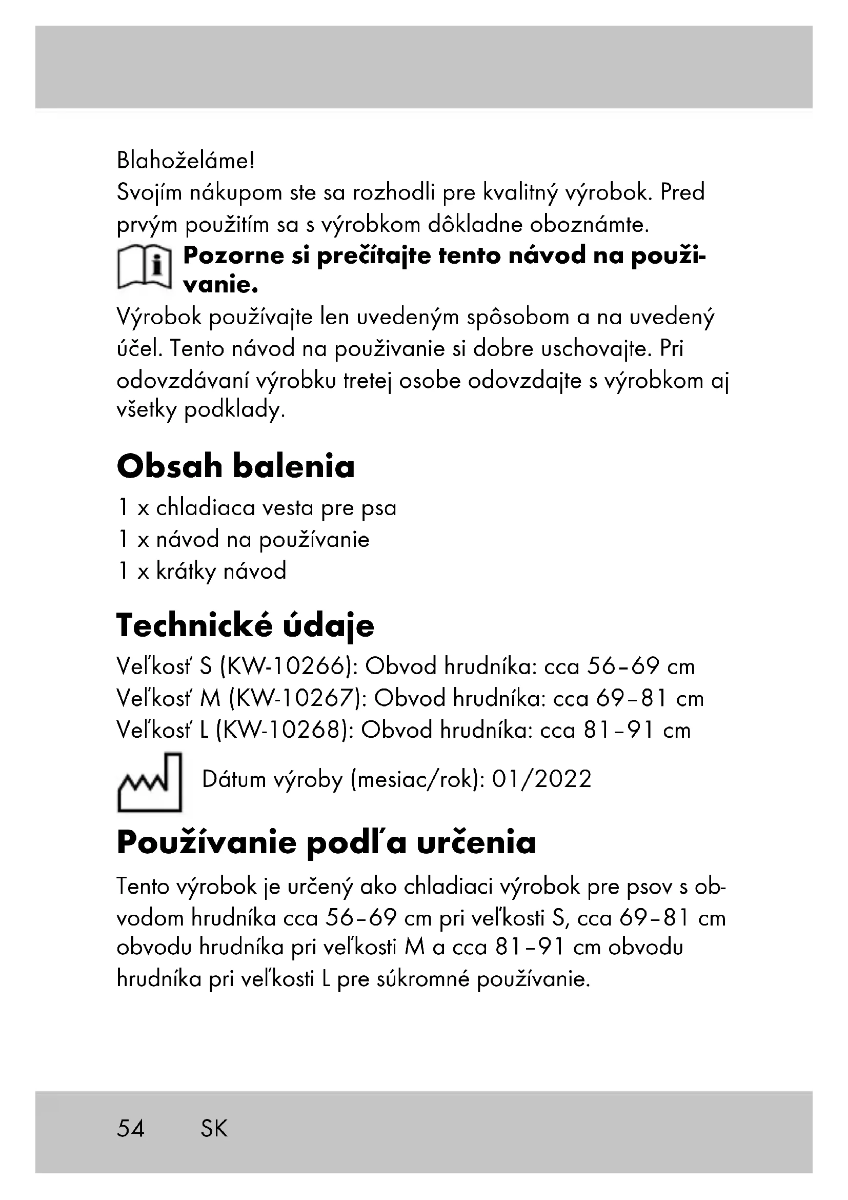Upozornenie: Dbajte na to, aby vzdialenosť medzi chrb- tom a výrobkom bola na šírku dvoch prstov. B59SK Skladovanie, čistenie Výrobok sa z dôvodu funkčnosti musí pravidelne mechanicky čistiť. Pri nepoužívaní skladujte výrobok vždy suchý a čistý pri izbovej teplote. Pri miernom znečistení čistite vodou a na záver utrite do sucha handrou. DÔLEŽITÉ! Výrobok nikdy nečistite ostrými čistiacimi pro- striedkami. V prípade ochorenia Vášho zvieraťa príp. po ochorení sa vý- robok musí dezinfikovať. Mali by ste sa spojiť s veterinárnym lekárom, ktorému dôverujete, a prekonzultovať s ním vhodné hygienické a dezinfekčné prostriedky. Pokyny k likvidácii Výrobok a obalový materiál zlikvidujte v súlade s aktuálnymi miestnymi predpismi. Obalový materiál, ako napr. fóliové vrecúško nepatrí do rúk detí. Obalový materiál uschovajte mimo dosahu detí. Výrobky a obaly likvidujte ekologickým spôsobom. Recyklačný kód slúži na označenia rôznych materiálov na navrátenie do obehu opätovného využitia. Kód sa skladá z recyklačného symbolu - kto- rý má odzrkadľovať zhodnotenie recyklačnýého obehu - a číslo označujúce materiál.60 SK Pokyny k záruke a priebehu servisu Výrobok bol vyrobený veľmi starostlivo a pod stálou kontrolou. Na tento výrobok poskytuje DELTA-SPORT HANDELSKONTOR GmbH súkromným koncovým užívateľom trojročnú záruku odo dňa kúpy (záručná lehota) po splnení nasledovných podmienok. Záruka platí len na chyby materiálu a spracovania. Záruka sa netýka dielov, ktoré podliehajú bežnému opotrebeniu a preto ich možno považovať za opotrebiteľné diely (napr. batérie), ako aj krehkých dielov, napr. vypínače, akumulátory alebo diely, ktoré sú vyrobené zo skla. Nároky z tejto záruky zanikajú, keď sa výrobok používal neodborne alebo nesprávne, mimo určenia na používanie alebo určeného rozsahu používania alebo neboli dodržané pokyny návodu na obsluhu, s výnimkou, že koncový užívateľ preukáže, že ide o chybu materiálu alebo spracovania, kto- rá nebola spôsobená niektorou z hore uvedených okolností. Záruku je možné uplatniť len počas záručnej lehoty po pred- ložení originálu pokladničného dokladu. Originál poklad- ničného dokladu preto prosím uschovajte. Záručná doba sa kvôli prípadným záručným opravám, zákonnej záruke alebo ako obchodné gesto nepredlžuje. Platí to aj pre vymenené a opravené diely. Pri reklamáciách sa prosím najskôr obráťte na dole uvedenú Service-Hotline alebo sa s nami spojte prostredníctvom e-mailu. Ak sa jedná o záručný prípad, výrobok – podľa našej voľby – bezplatne opravíme, vymeníme alebo vrátime kúpnu cenu.61SK Ďalšie práva zo záruky nevyplývajú. Vaše zákonné práva, hlavne nároky na záručné plnenie voči príslušnému predaj- covi, nie sú touto zárukou obmedzené. IAN: 389124_2107 Servis Slovensko Tel.: 0850 232001 E-Mail: deltasport@lidl.sk62 ES ¡Enhorabuena! Con su compra se ha decidido por un artículo de gran calidad. Familiarícese con el artículo antes de usarlo por primera vez. Para ello, lea detenidamente las siguientes instrucciones de uso. Use el artículo solo de la forma descrita y para los campos de aplicación indicados. Conserve estas instrucciones de uso a buen recaudo. Entregue todos los documentos en caso de traspasar el artículo a terceros. Contenido de suministro 1 x chaleco refrescante para perros 1 x instrucciones de uso 1 x guía rápida Datos técnicos Talla S (KW-10266): Contorno de pecho: aprox. 56–69 cm Talla M (KW-10267): Contorno de pecho: aprox. 69–81 cm Talla L (KW-10268): Contorno de pecho: aprox. 81–91 cm Fecha de fabricación (mes/año): 01/2022 Uso conforme al fin previsto Este artículo ha sido diseñado para aportar frescor a perros con un contorno de pecho de aprox. 56–69 cm en la talla S, de aprox. 69–81 cm en la talla M y de aprox. 81–91 cm en la talla L y es de uso privado.63ES Instrucciones de seguridad ¡Peligro de lesiones!