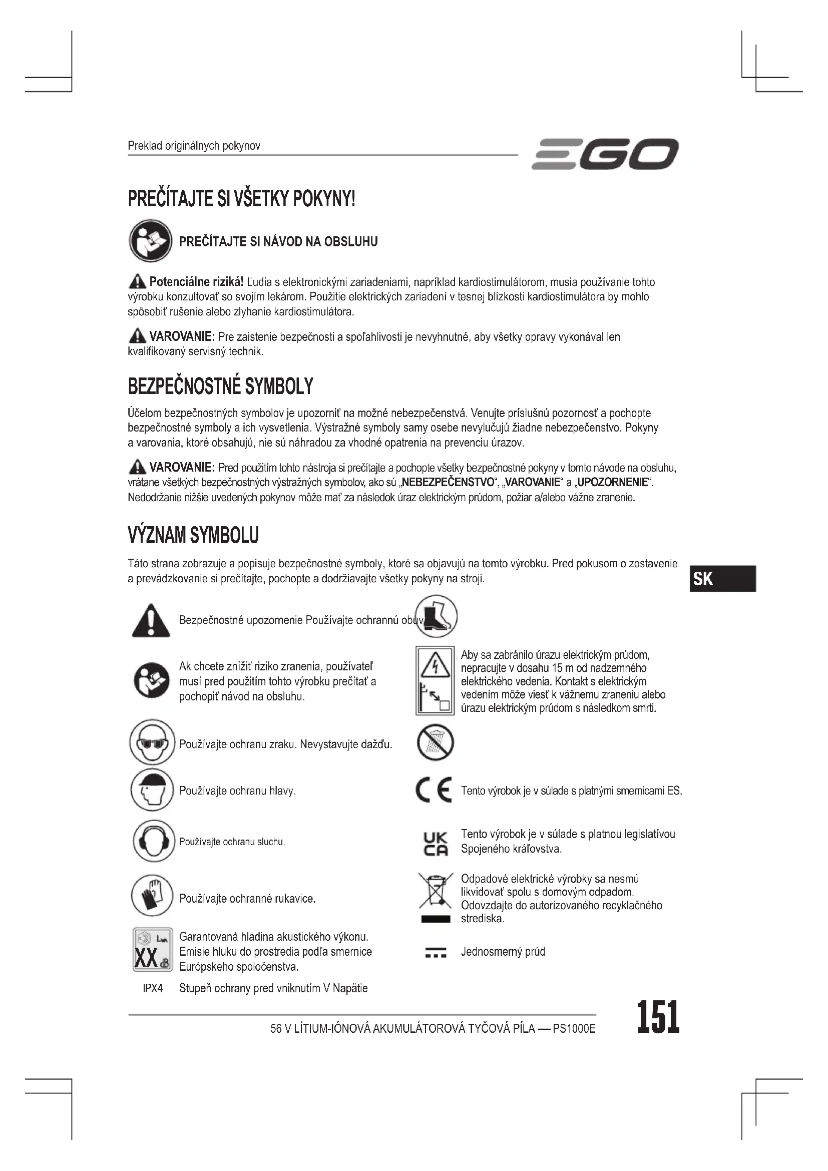 Garantovaná hladina akustického výkonu. Emisie hluku do prostredia podľa smernice Európskeho spoločenstva.Jednosmerný prúd IPX4 Stupeň ochrany pred vniknutím V NapätiePreklad originálnych pokynov56 V LÍTIUM-IÓNOVÁ AKUMULÁTOROVÁ TYČOVÁ PÍLA — PS1000E152