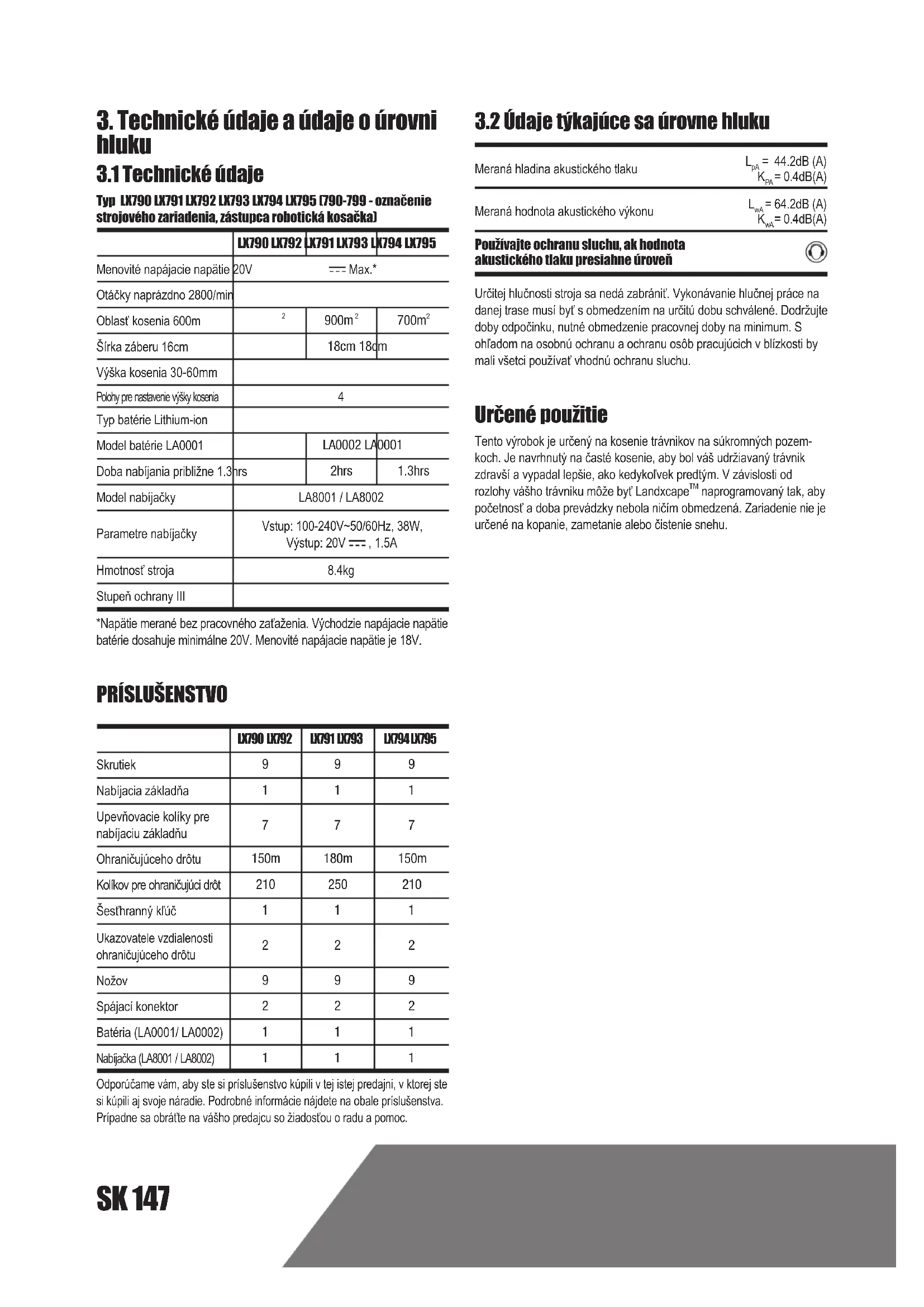 Typ LX790 LX791 LX792 LX793 LX794 LX795 (790-799 - označenie strojového zariadenia, zástupca robotická kosačka) LX790 LX792 LX791 LX793 LX794 LX795 Menovité napájacie napätie 20V Max.* Otáčky naprázdno 2800/min Oblasť kosenia 600m