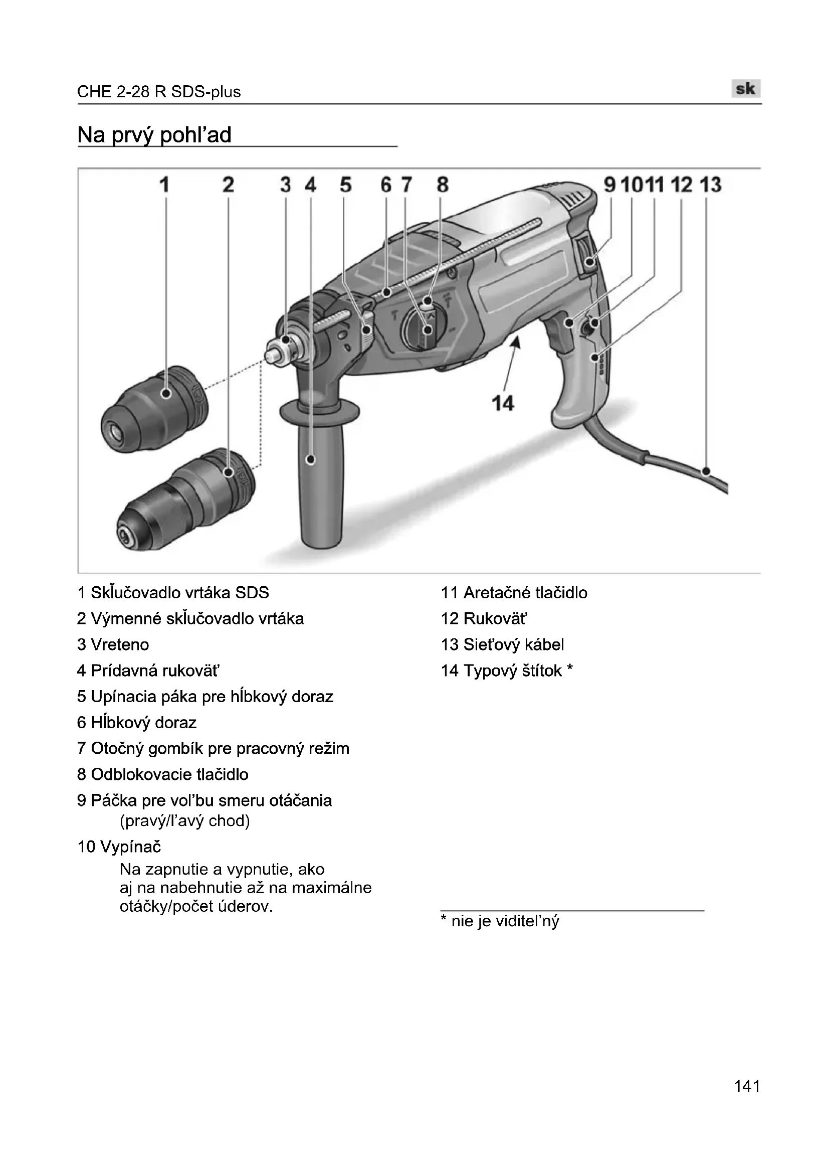 v bezchybnom bezpečnostne- technickom stave. Okamžite odstráňte poruchy, ktoré obme- dzujú bezpečnosť. Stanovené použitie Vŕtacie a sekacie kladivo CHE 2-28 R SDS-plus je určené – na živnostenské nasadenie v priemysle a remeslníctve, – na príklepové vŕtanie v murive a betóne na uchytenie hmoždiniek a zakotvenia a prerážanie otvorov, – pre l’ahké temovacie práce na odstraňo- vanie omietky a obkladov, – na použitie s nástrojom, ktorý je pre tento účel vhodný a výrobcom pre toto náradie doporučený. Bezpečnostné pokyny pre kladivá Noste protihlukovú ochranu. Pôsobenie hluku môže zapríčiniť stratu sluchu. Používajte prídavné rukoväti dodávané s náradím. Strata kontroly môže viesť k poraneniam. Držte náradie len za izolované plochy rukoväti, ak budete vykonávať práce, pri ktorých môže pracovný nástroj zasiah- nuť skryté elektrické vedenia alebo vlastný sieťový kábel. Kontakt s vedením, ktoré je pod napätím, spôsobí, že aj kovové súčiastky náradia sa dostanú pod napätie, čo má za následok zásah elektrickým prúdom. Ďalšie bezpečnostné pokyny Používajte vhodné prístroje na vyhl’adá- vanie skrytých elektrických vedení, alebo sa obráťte na miestny energetický pod- nik. Kontakt s elektrickými vedeniami môže spôsobiť požiar alebo mať za násle- dok zásah elektrickým prúdom. Poškodenie plynového potrubia môže mať za následok výbuch. Preniknutie do vodovodného potrubia spôsobí vecné škody alebo môže spôsobiť úraz elektrickým prúdom. Pri práci držte elektrické náradie pevne obidvomi rukami a postarajte sa o stabilný postoj. Elektrické náradie bude obidvomi rukami vedené istejšie. Zabezpečte obrobok. Obrobok, ktorý je uchytený upínacím zariadením, je držaný spol’ahlivejšie ako Vašou rukou. Nepoužívajte elektrické náradie s poško- deným káblom. Nedotýkajte sa poškode- ného kábla a vytiahnite sieťovú zástrčku, ak sa kábel v priebehu práce poškodí. Poškodené káble zvyšujú riziko úrazu elektrickým prúdom. Používajte iba nástroje s uchytením SDS plus. Zatiahnutím za nástroj skontrolujte jeho správne zaistenie. Poškodený ochranný protiprachový kryt nechajte okamžite vymeniť. Ochranný protiprachový kryt zabraňuje vniknutiu prachu do uchytenia nástroja.CHE 2-28 R SDS-plus