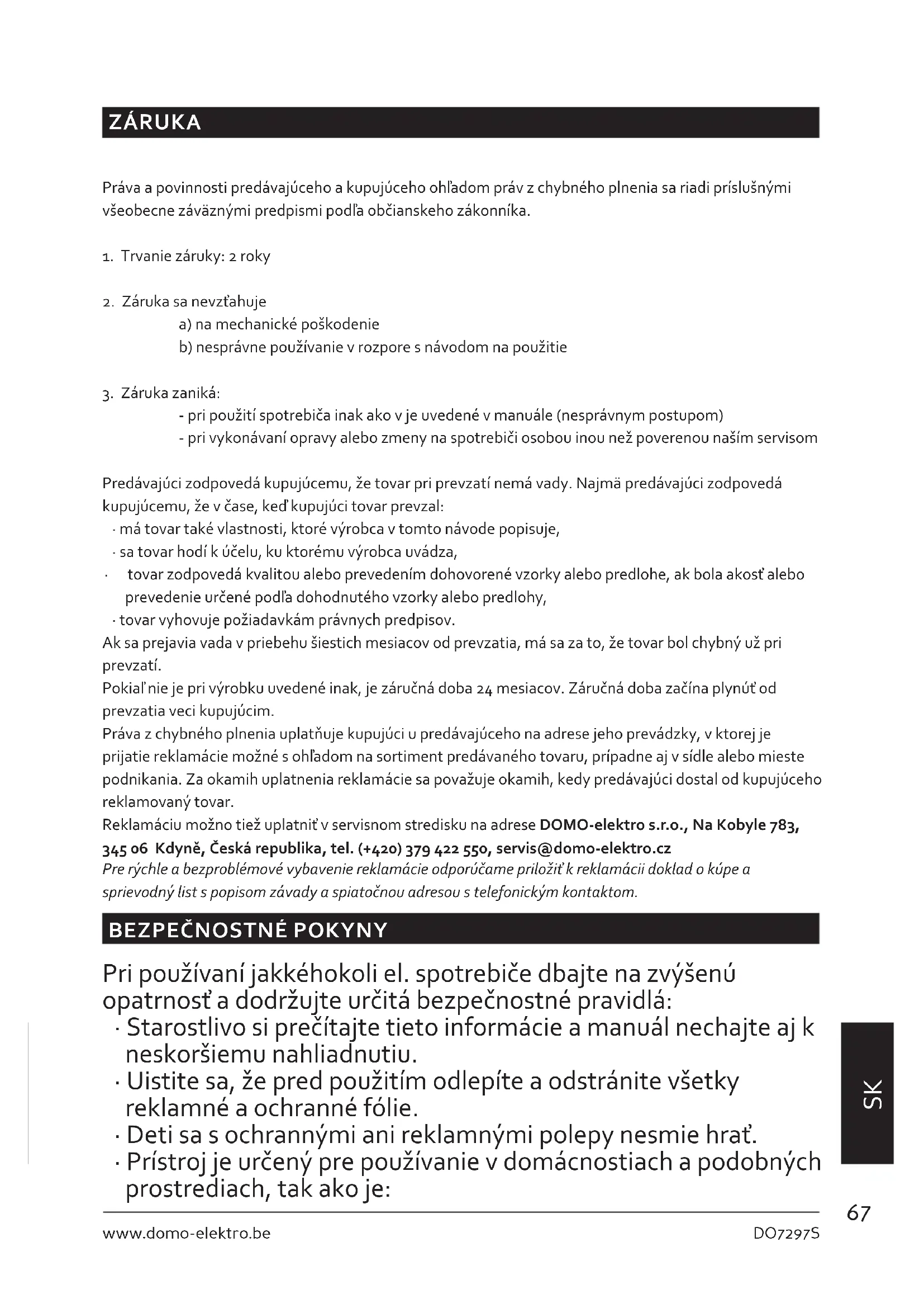 - tovar vyhovuje požiadavkám právnych predpisov. Ak sa prejavia vada v priebehu šiestich mesiacov od prevzatia, má sa za to, že tovar bol chybný už pri prevzatí. Pokiaľ nie je pri výrobku uvedené inak, je záručná doba 24 mesiacov. Záručná doba začína plynúť od prevzatia veci kupujúcim. Práva z chybného plnenia uplatňuje kupujúci u predávajúceho na adrese jeho prevádzky, v ktorej je prijatie reklamácie možné s ohľadom na sortiment predávaného tovaru, prípadne aj v sídle alebo mieste podnikania. Za okamih uplatnenia reklamácie sa považuje okamih, kedy predávajúci dostal od kupujúceho reklamovaný tovar. Reklamáciu možno tiež uplatniť v servisnom stredisku na adrese DOMO-elektro s.r.o., Na Kobyle 783, 345 06 Kdyně, Česká republika, tel. (+420) 379 422 550, servis@domo-elektro.cz Pre rýchle a bezproblémové vybavenie reklamácie odporúčame priložiť k reklamácii doklad o kúpe a sprievodný list s popisom závady a spiatočnou adresou s telefonickým kontaktom.
