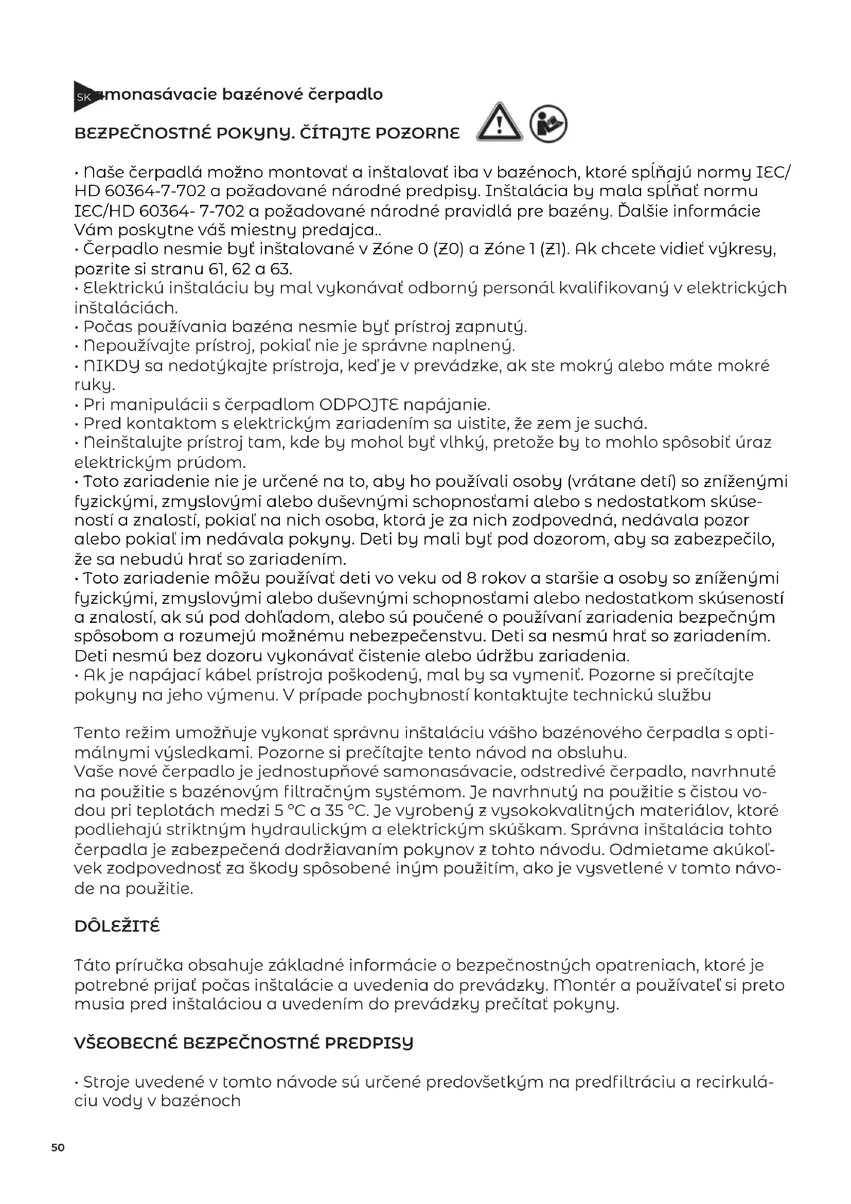 | Bezpečnosť | Používajte rukavice a ochranné okuliare pri inštalácii, neponárajte čerpadlo a pred akýmkoľvek zásahom ho odpojte od napájania. |