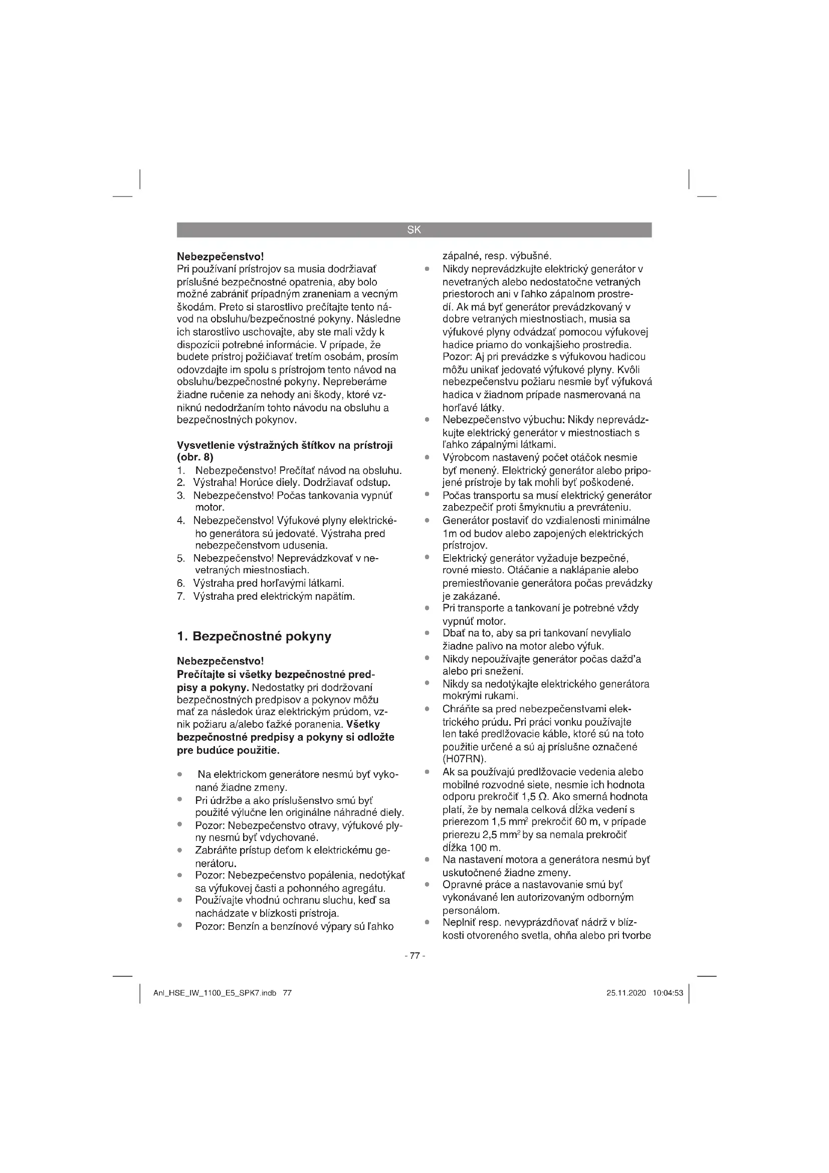 Páčku sýtiča (11) po naštartovaní motora opäť posunúť naspäť. Pozor! Štartovacie lanko vytiahnuť vždy po- maly až po prvý odpor a až potom lanko rýchlo vytiahnuť von. Po uskutočnenom naštartovaní nenechajte lanko, aby sa samo vymrštilo späť. Pozor! Pri štartovaní pomocou reverzného štartéra môže náhlym spätným nárazom, spôsobeným rozbie- hajúcim sa motorom, dôjsť k poraneniam ruky. Pri štartovaní motora noste ochranné rukavice. Anl_HSE_IW_1100_E5_SPK7.indb 80Anl_HSE_IW_1100_E5_SPK7.indb 80 25.11.2020 10:04:5525.11.2020 10:04:55SK