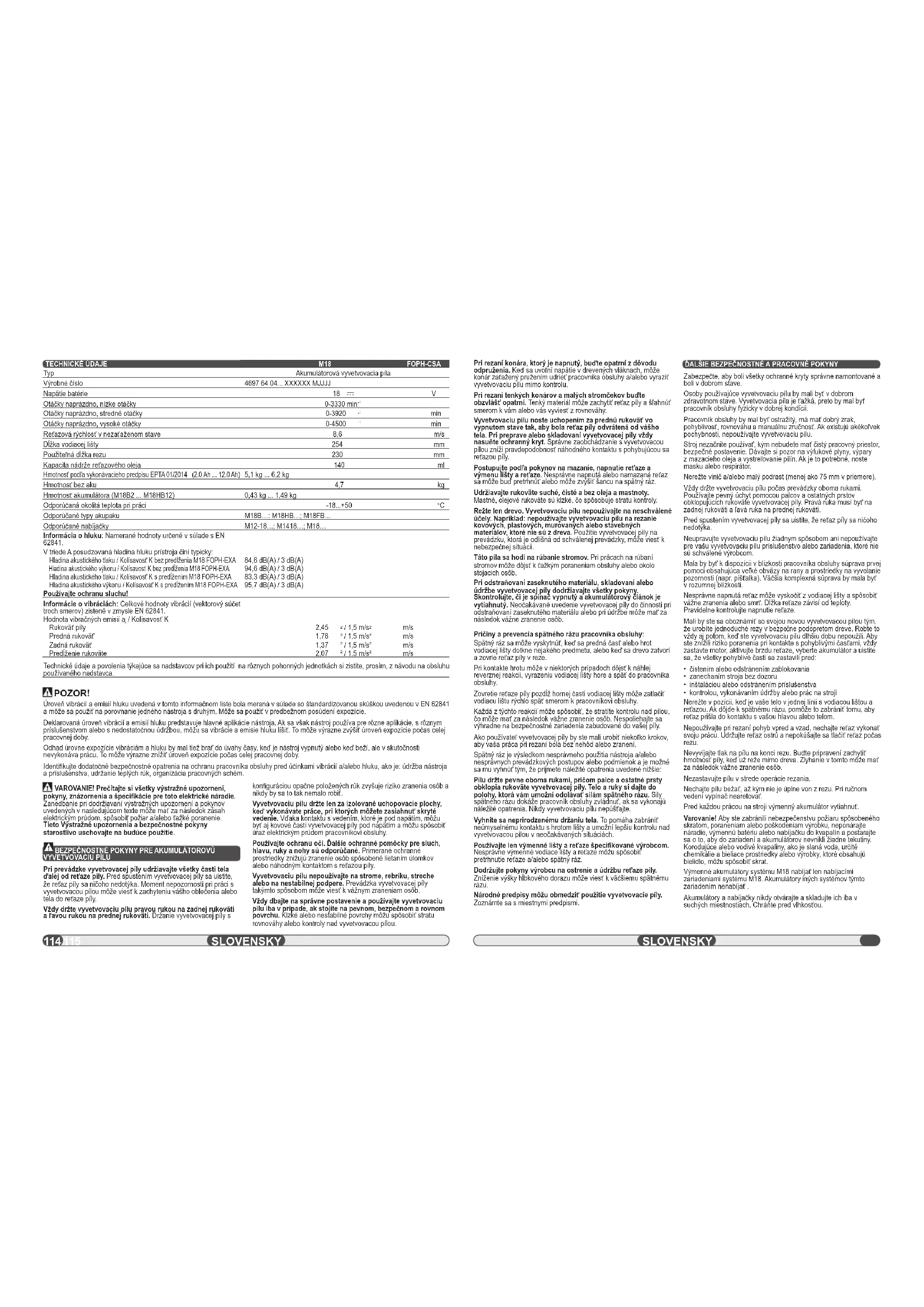 V triede A posudzovaná hladina hluku prístroja činí typicky: Hladina akustického tlaku / Kolísavosť K bez predĺženia M18 FOPH-EXA Hladina akustického výkonu / Kolísavosť K bez predĺženia M18 FOPH-EXA Hladina akustického tlaku / Kolísavosť K s predĺžením M18 FOPH-EXA Hladina akustického výkonu / Kolísavosť K s predĺžením M18 FOPH-EXA Používajte ochranu sluchu! Informácie o vibráciách: Celkové hodnoty vibrácií (vektorový súčet troch smerov) zistené v zmysle EN 62841. Hodnota vibračných emisií a
