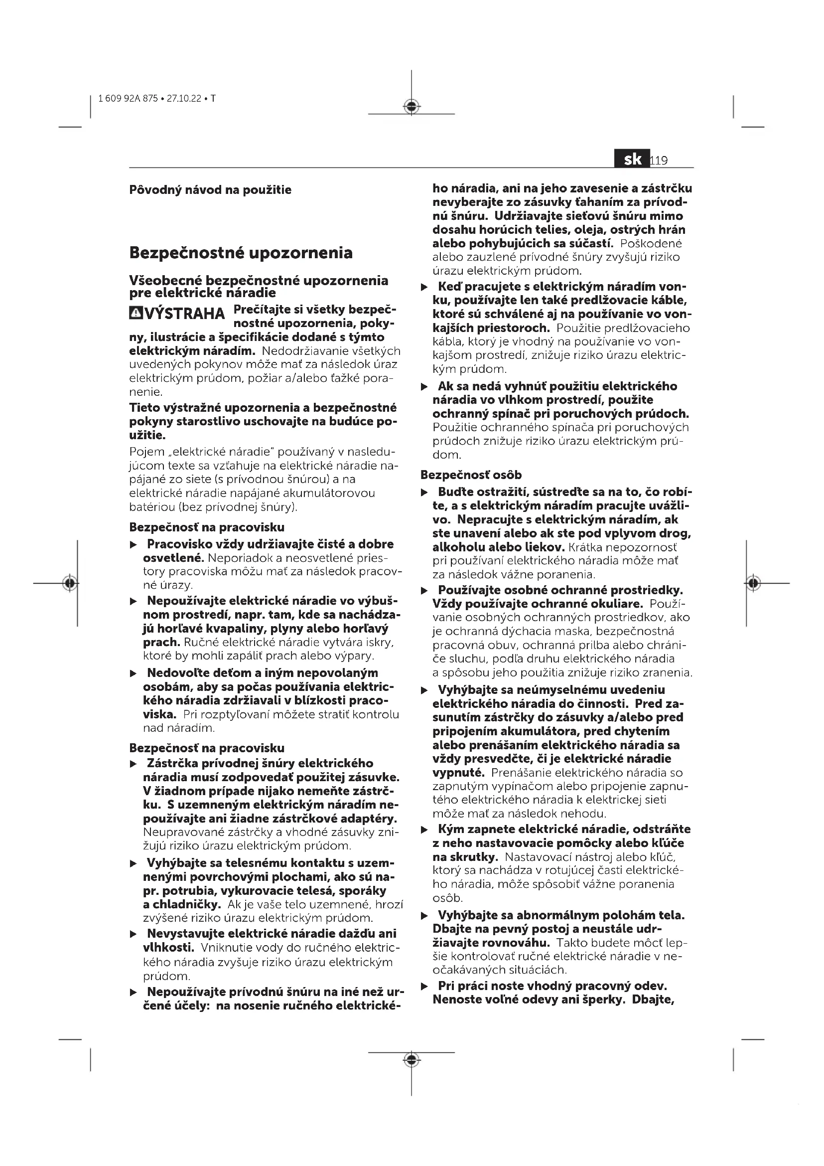 apri skladovaní °C –20…+50 Odporúčané akumulá- tory GBA18V… ProCORE18V… Odporúčané nabíjačky GAL18… A) Merané pri 20−25°C sakumulátoromGBA18V4.0Ah. B) Vzávislosti od použitého akumulátora C) Obmedzený výkon pri teplotách <0°C. Informácia ohlučnosti/vibráciáchSlovenčina Hodnoty emisií hluku zistené podľa EN62841‑2‑11. Úroveň hluku elektrického náradia pri použití vá- hového filtraA je typicky: úroveň akustického tlaku 82dB(A); úroveň akustického výkonu 93dB(A). Neistota K=5dB. Noste prostriedky na ochranu sluchu! Celkové hodnoty vibrácií a