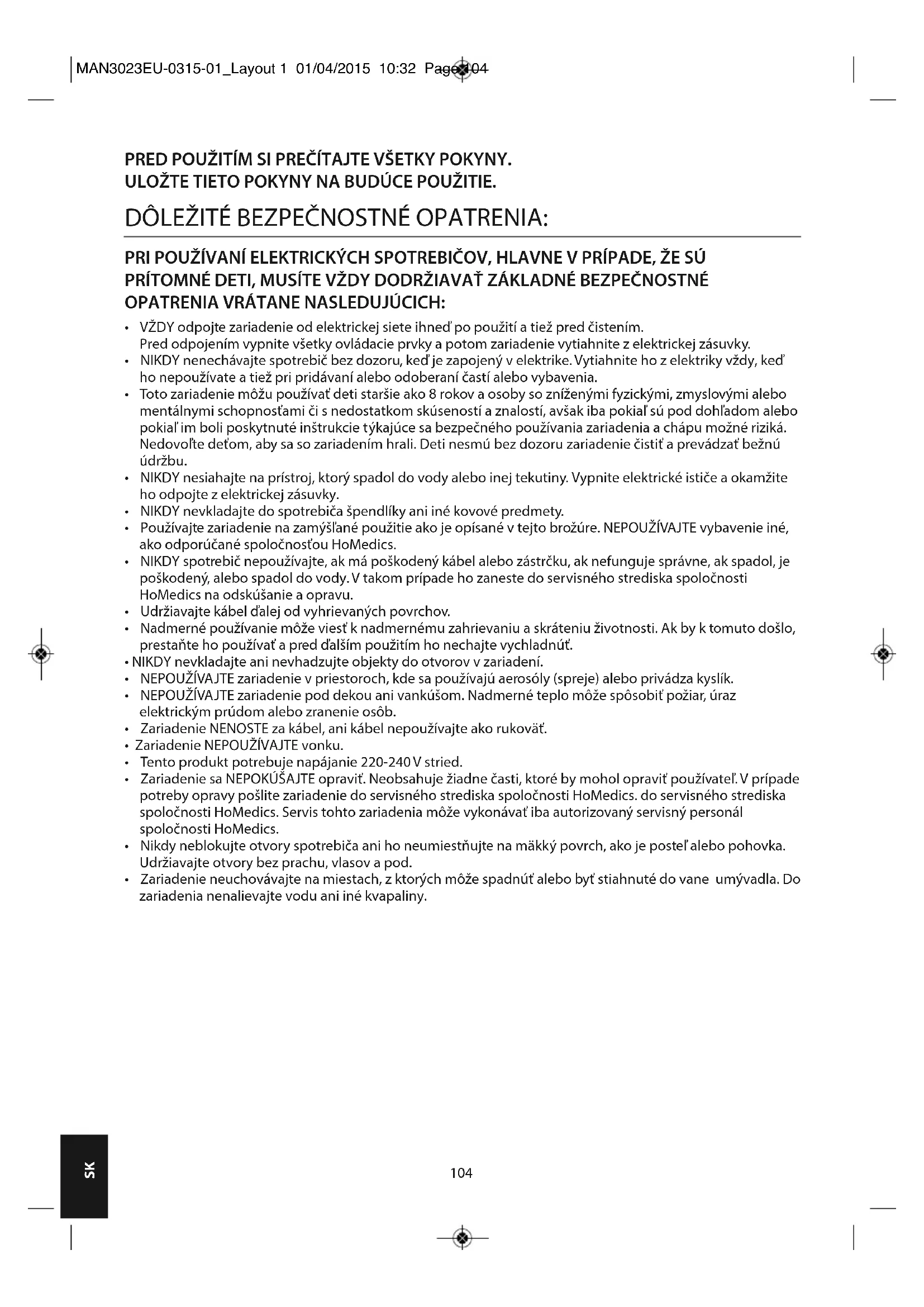 - Zariadenie neuchovávajte na miestach, z ktorých môže spadnúť alebo byť stiahnuté do vane umývadla. Do zariadenia nenalievajte vodu ani iné kvapaliny. MAN3023EU-0315-01_Layout 1 01/04/2015 10:32 Page 104105