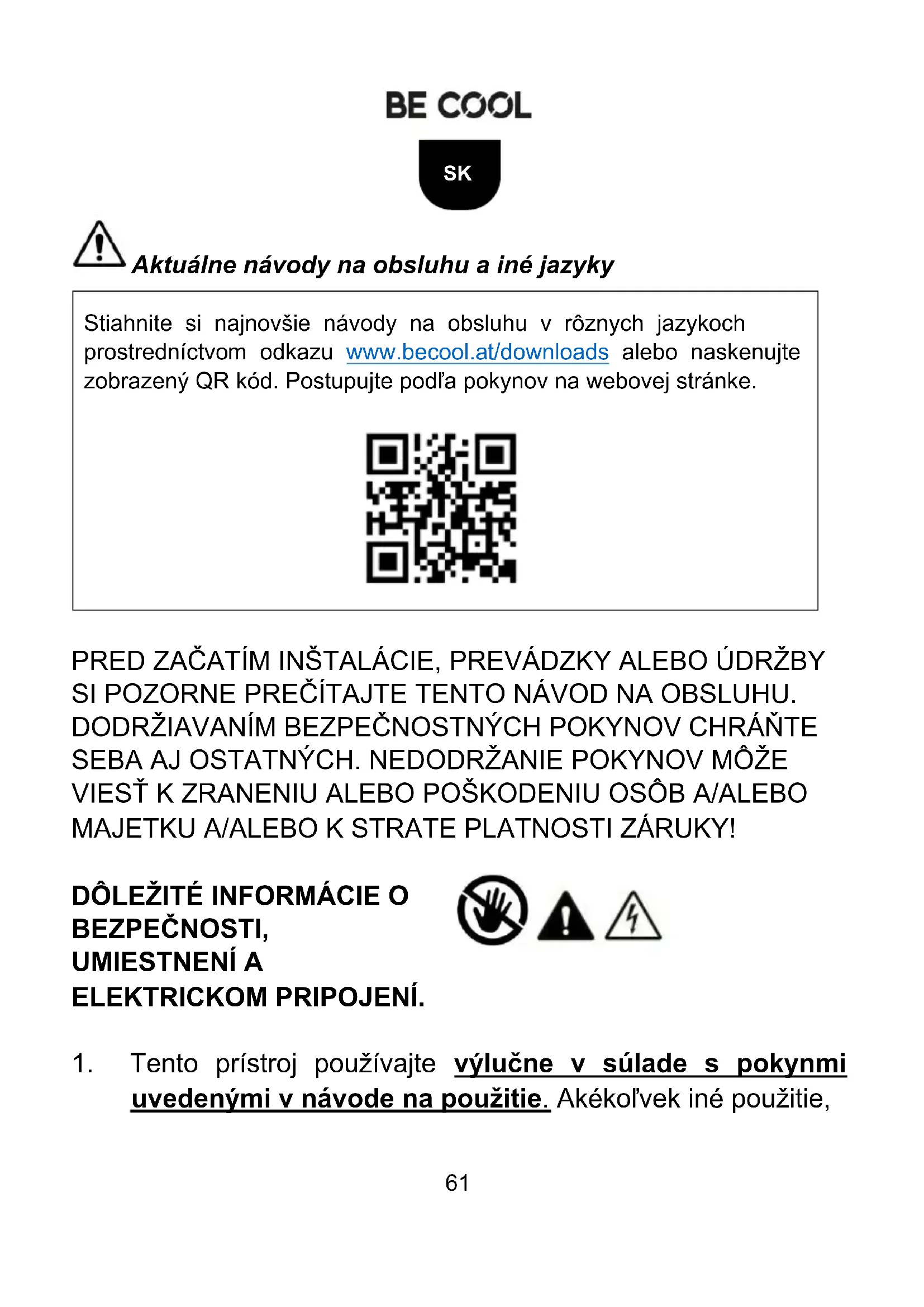 Stiahnite si najnovšie návody na obsluhu v rôznych jazykoch prostredníctvom odkazu www.becool.at/downloads alebo naskenujte zobrazený QR kód. Postupujte podľa pokynov na webovej stránke.
