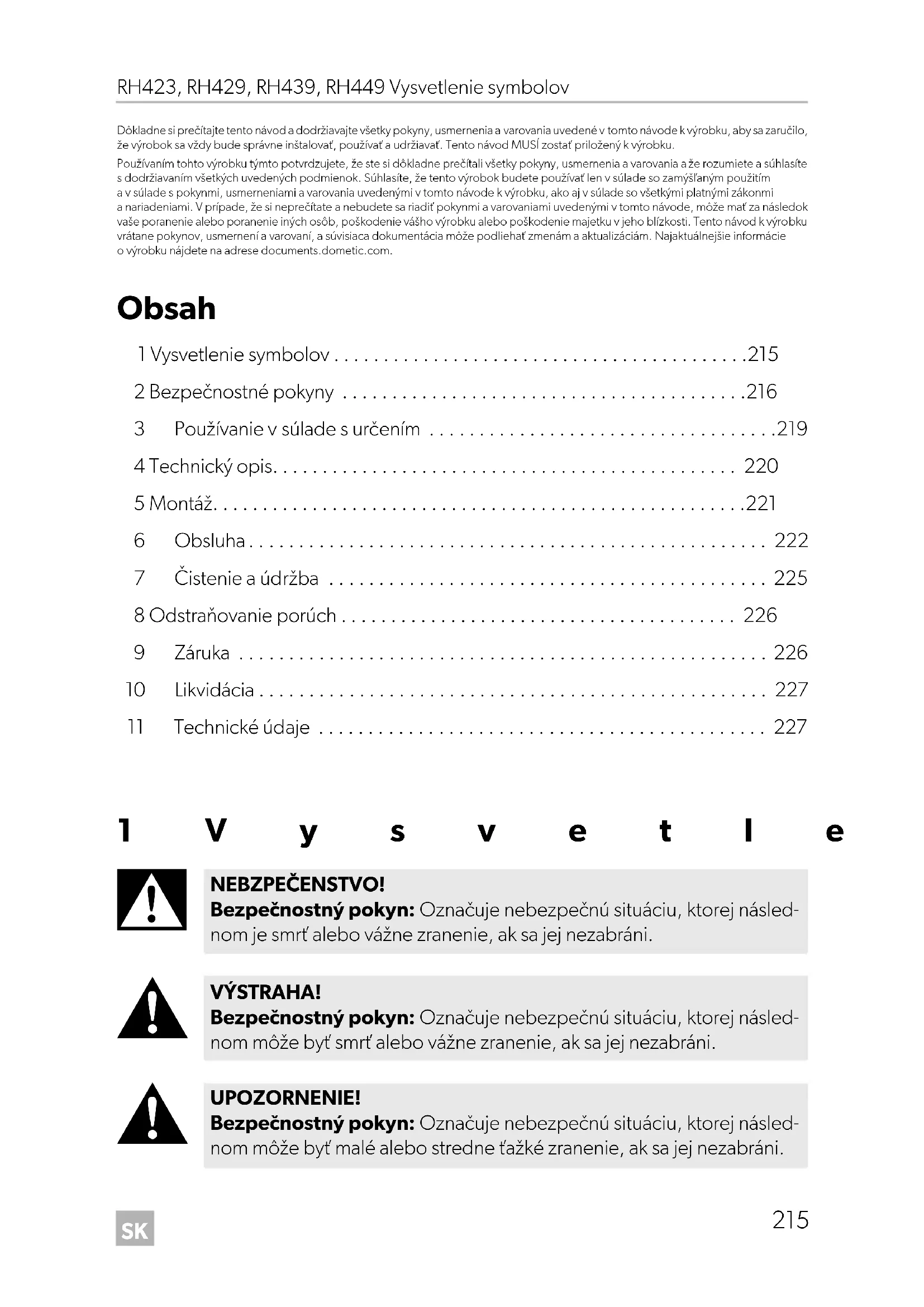 - Dôkladne si prečítajte tento návod a dodržiavajte všetky pokyny, usmernenia a varovania uvedené v tomto návode k výrobku, aby sa zaručilo, že výrobok sa vždy bude správne inštalovať, používať a udržiavať. Tento návod MUSÍ zostať priložený k výrobku. Používaním tohto výrobku týmto potvrdzujete, že ste si dôkladne prečítali všetky pokyny, usmernenia a varovania a že rozumiete a súhlasíte s dodržiavaním všetkých uvedených podmienok. Súhlasíte, že tento výrobok budete používať len v súlade so zamýšľaným použitím a v súlade s pokynmi, usmerneniami a varovania uvedenými v tomto návode k výrobku, ako aj v súlade so všetkými platnými zákonmi a nariadeniami. V prípade, že si neprečítate a nebudete sa riadiť pokynmi a varovaniami uvedenými v tomto návode, môže mať za následok vaše poranenie alebo poranenie iných osôb, poškodenie vášho výrobku alebo poškodenie majetku v jeho blízkosti. Tento návod k výrobku vrátane pokynov, usmernení a varovaní, a súvisiaca dokumentácia môže podliehať zmenám a aktualizáciám. Najaktuálnejšie informácie o výrobku nájdete na adrese documents.dometic.com. Obsah 1 Vysvetlenie symbolov p. 215