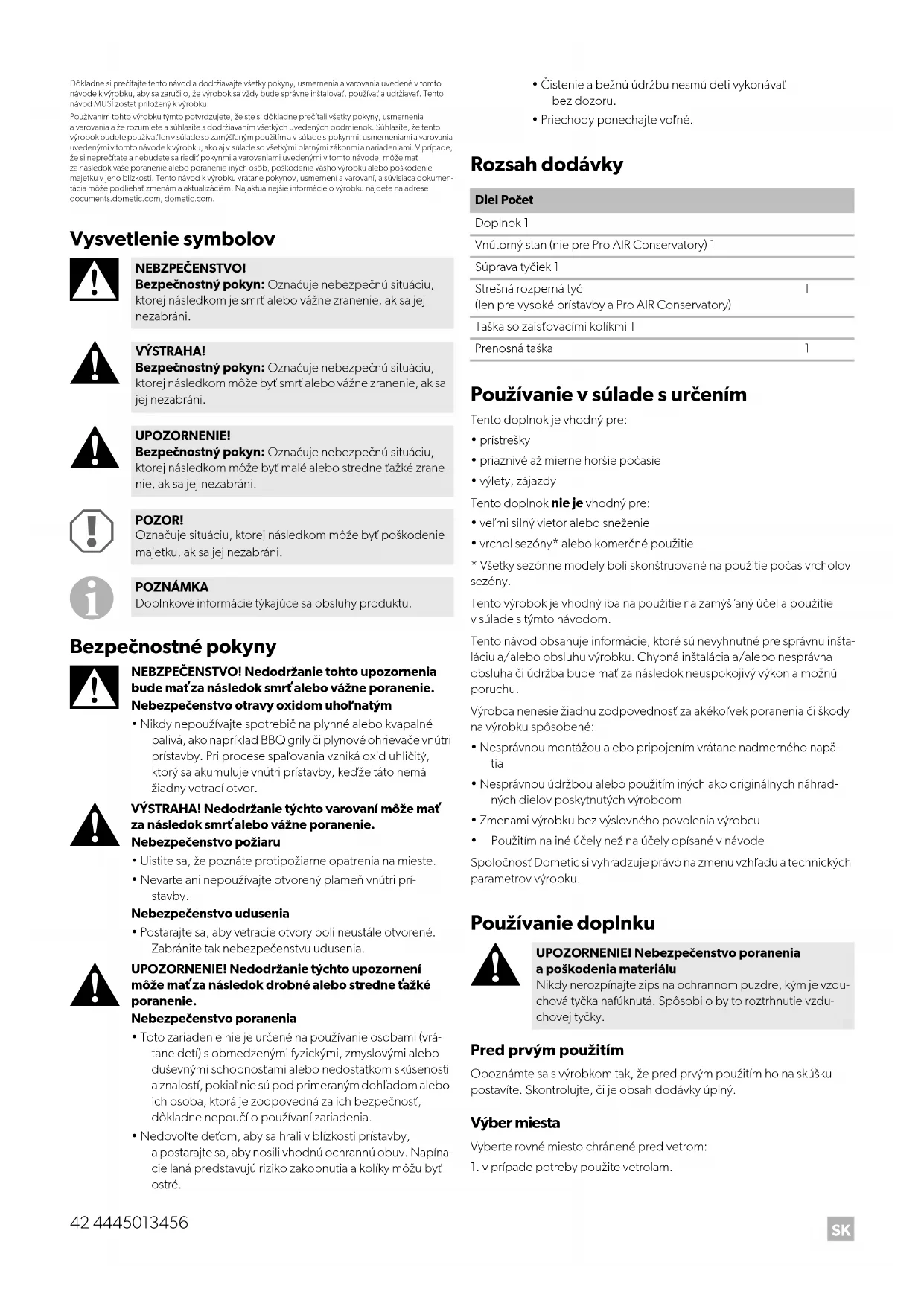 NEBZPEČENSTVO! Bezpečnostný pokyn: Označuje nebezpečnú situáciu, ktorej následkom je smrť alebo vážne zranenie, ak sa jej nezabráni. VÝSTRAHA! Bezpečnostný pokyn: Označuje nebezpečnú situáciu, ktorej následkom môže byť smrť alebo vážne zranenie, ak sa jej nezabráni. UPOZORNENIE! Bezpečnostný pokyn: Označuje nebezpečnú situáciu, ktorej následkom môže byť malé alebo stredne ťažké zrane- nie, ak sa jej nezabráni. POZOR! Označuje situáciu, ktorej následkom môže byť poškodenie majetku, ak sa jej nezabráni. POZNÁMKA Doplnkové informácie týkajúce sa obsluhy produktu. Diel Počet Doplnok 1 Vnútorný stan (nie pre Pro AIR Conservatory) 1 Súprava tyčiek 1 Strešná rozperná tyč (len pre vysoké prístavby a Pro AIR Conservatory)