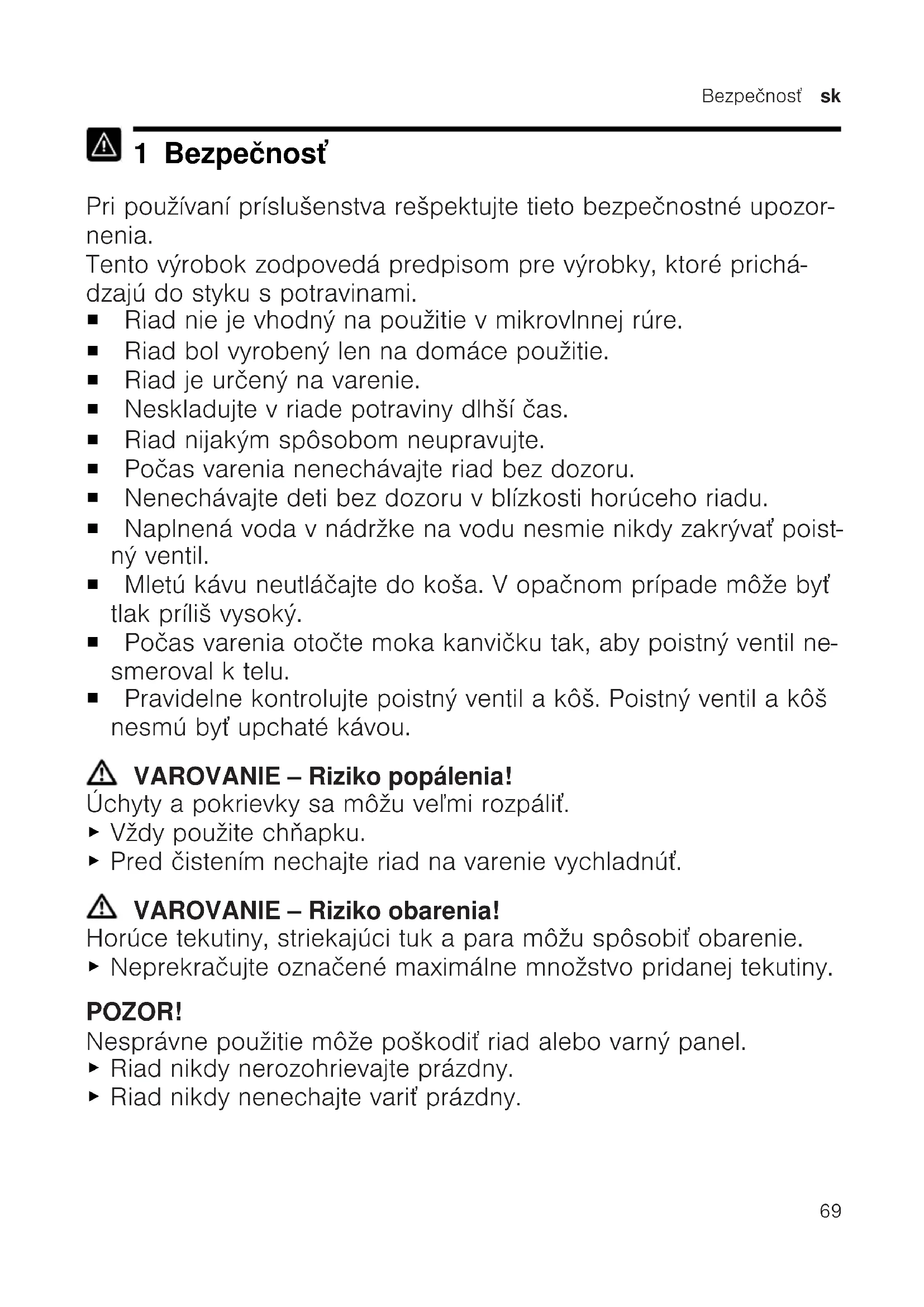 1 Bezpečnosť Pri používaní príslušenstva rešpektujte tieto bezpečnostné upozor- nenia. Tento výrobok zodpovedá predpisom pre výrobky, ktoré prichá- dzajú do styku spotravinami. ¡ Riad nie je vhodný na použitie vmikrovlnnej rúre. ¡ Riad bol vyrobený len na domáce použitie. ¡ Riad je určený na varenie. ¡ Neskladujte vriade potraviny dlhší čas. ¡ Riad nijakým spôsobom neupravujte. ¡ Počas varenia nenechávajte riad bez dozoru. ¡ Nenechávajte deti bez dozoru vblízkosti horúceho riadu. ¡ Naplnená voda vnádržke na vodu nesmie nikdy zakrývať poist- ný ventil. ¡ Mletú kávu neutláčajte do koša. Vopačnom prípade môže byť tlak príliš vysoký. ¡ Počas varenia otočte moka kanvičku tak, aby poistný ventil ne- smeroval ktelu. ¡ Pravidelne kontrolujte poistný ventil akôš. Poistný ventil akôš nesmú byť upchaté kávou. VAROVANIE‒Riziko popálenia! Úchyty apokrievky sa môžu veľmi rozpáliť. ▶ Vždy použite chňapku. ▶ Pred čistením nechajte riad na varenie vychladnúť. VAROVANIE‒Riziko obarenia! Horúce tekutiny, striekajúci tuk apara môžu spôsobiť obarenie. ▶ Neprekračujte označené maximálne množstvo pridanej tekutiny. POZOR! Nesprávne použitie môže poškodiť riad alebo varný panel. ▶ Riad nikdy nerozohrievajte prázdny. ▶ Riad nikdy nenechajte variť prázdny.sk Rozsah dodávky Rozsah dodávky 2 Rozsah dodávky Rozsah dodávky Po vybalení skontrolujte všetky diely na eventuálne poškodenia vzniknuté pri preprave a úplnosť pri dodaní.
