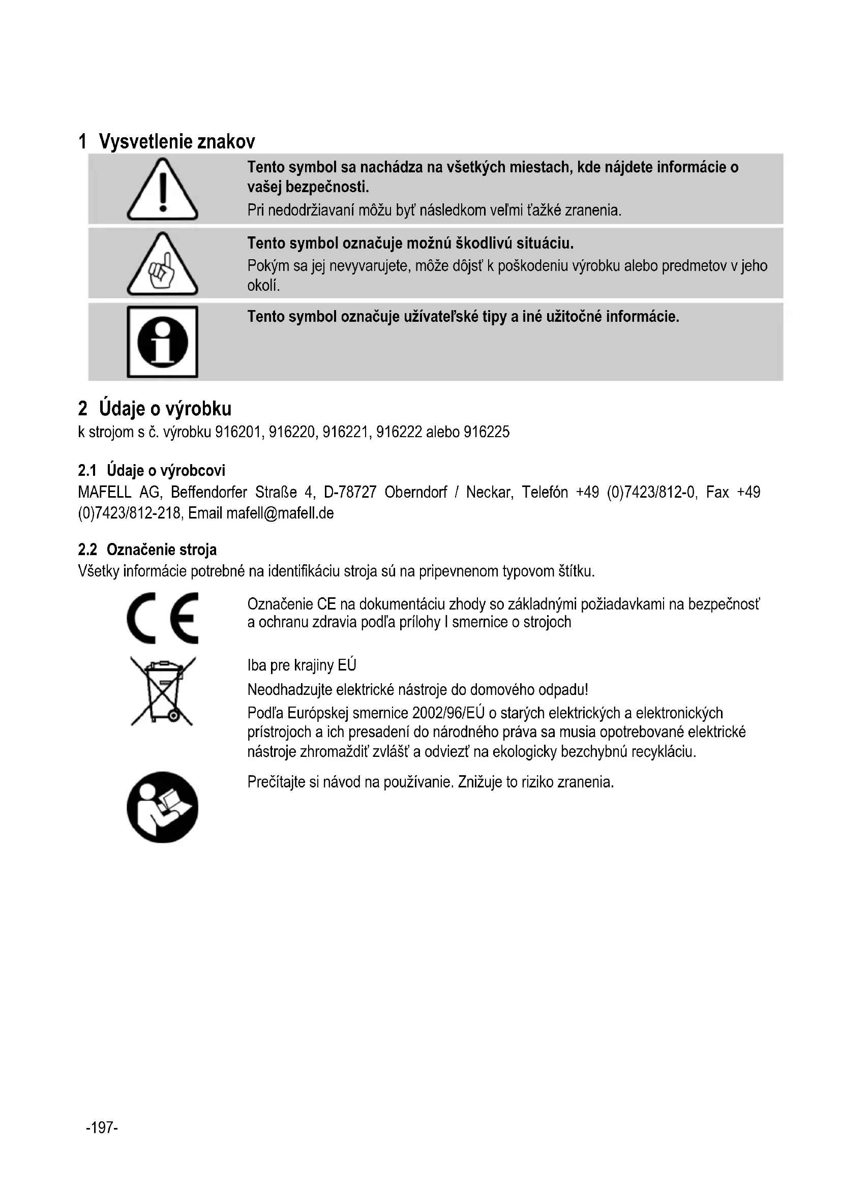 2 Údaje o výrobku k strojom s č. výrobku 916201, 916220, 916221, 916222 alebo 916225