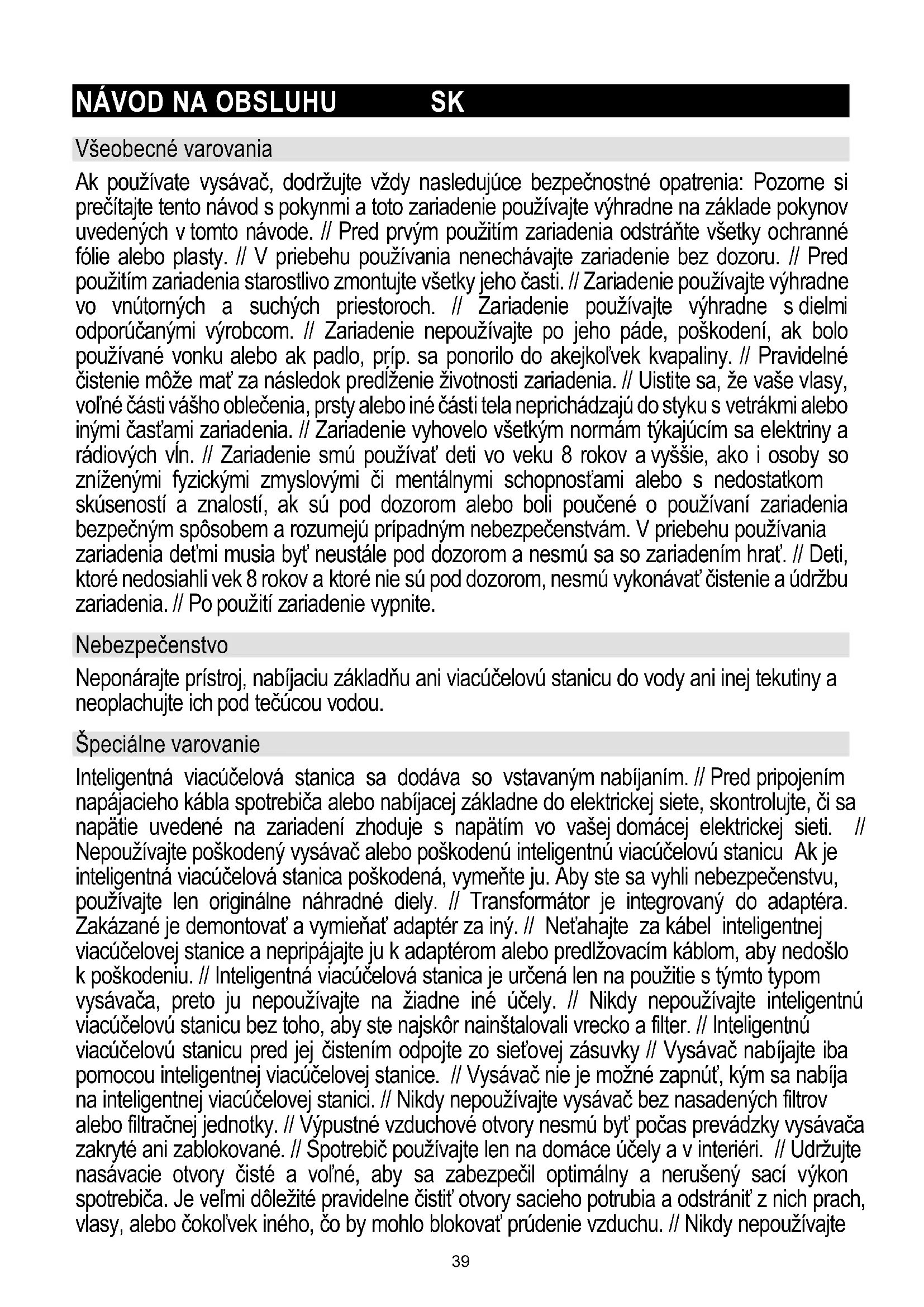Všeobecné varovania Ak používate vysávač, dodržujte vždy nasledujúce bezpečnostné opatrenia: Pozorne si prečítajte tento návod s pokynmi a toto zariadenie používajte výhradne na základe pokynov uvedených v tomto návode. // Pred prvým použitím zariadenia odstráňte všetky ochranné fólie alebo plasty. // V priebehu používania nenechávajte zariadenie bez dozoru. // Pred použitím zariadenia starostlivo zmontujte všetky jeho časti. // Zariadenie používajte výhradne vo vnútorných a suchých priestoroch. // Zariadenie používajte výhradne s dielmi odporúčanými výrobcom. // Zariadenie nepoužívajte po jeho páde, poškodení, ak bolo používané vonku alebo ak padlo, príp. sa ponorilo do akejkoľvek kvapaliny. // Pravidelné čistenie môže mať za následok predĺženie životnosti zariadenia. // Uistite sa, že vaše vlasy, voľné části vášho oblečenia, prsty alebo iné části tela neprichádzajú do styku s vetrákmi alebo inými časťami zariadenia. // Zariadenie vyhovelo všetkým normám týkajúcím sa elektriny a rádiových vĺn. // Zariadenie smú používať deti vo veku 8 rokov a vyššie, ako i osoby so zníženými fyzickými zmyslovými či mentálnymi schopnosťami alebo s nedostatkom skúseností a znalostí, ak sú pod dozorom alebo boli poučené o používaní zariadenia bezpečným spôsobem a rozumejú prípadným nebezpečenstvám. V priebehu používania zariadenia deťmi musia byť neustále pod dozorom a nesmú sa so zariadením hrať. // Deti, ktoré nedosiahli vek 8 rokov a ktoré nie sú pod dozorom, nesmú vykonávať čistenie a údržbu zariadenia. // Po použití zariadenie vypnite. Nebezpečenstvo Neponárajte prístroj, nabíjaciu základňu ani viacúčelovú stanicu do vody ani inej tekutiny a neoplachujte ich pod tečúcou vodou. Špeciálne varovanie Inteligentná viacúčelová stanica sa dodáva so vstavaným nabíjaním. // Pred pripojením napájacieho kábla spotrebiča alebo nabíjacej základne do elektrickej siete, skontrolujte, či sa napätie uvedené na zariadení zhoduje s napätím vo vašej domácej elektrickej sieti. // Nepoužívajte poškodený vysávač alebo poškodenú inteligentnú viacúčelovú stanicu Ak je inteligentná viacúčelová stanica poškodená, vymeňte ju. Aby ste sa vyhli nebezpečenstvu, používajte len originálne náhradné diely. // Transformátor je integrovaný do adaptéra. Zakázané je demontovať a vymieňať adaptér za iný. // Neťahajte za kábel inteligentnej viacúčelovej stanice a nepripájajte ju k adaptérom alebo predlžovacím káblom, aby nedošlo k poškodeniu. // Inteligentná viacúčelová stanica je určená len na použitie s týmto typom vysávača, preto ju nepoužívajte na žiadne iné účely. // Nikdy nepoužívajte inteligentnú viacúčelovú stanicu bez toho, aby ste najskôr nainštalovali vrecko a filter. // Inteligentnú viacúčelovú stanicu pred jej čistením odpojte zo sieťovej zásuvky // Vysávač nabíjajte iba pomocou inteligentnej viacúčelovej stanice. // Vysávač nie je možné zapnúť, kým sa nabíja na inteligentnej viacúčelovej stanici. // Nikdy nepoužívajte vysávač bez nasadených filtrov alebo filtračnej jednotky. // Výpustné vzduchové otvory nesmú byť počas prevádzky vysávača zakryté ani zablokované. // Spotrebič používajte len na domáce účely a v interiéri. // Udržujte nasávacie otvory čisté a voľné, aby sa zabezpečil optimálny a nerušený sací výkon spotrebiča. Je veľmi dôležité pravidelne čistiť otvory sacieho potrubia a odstrániť z nich prach, vlasy, alebo čokoľvek iného, čo by mohlo blokovať prúdenie vzduchu. // Nikdy nepoužívajte