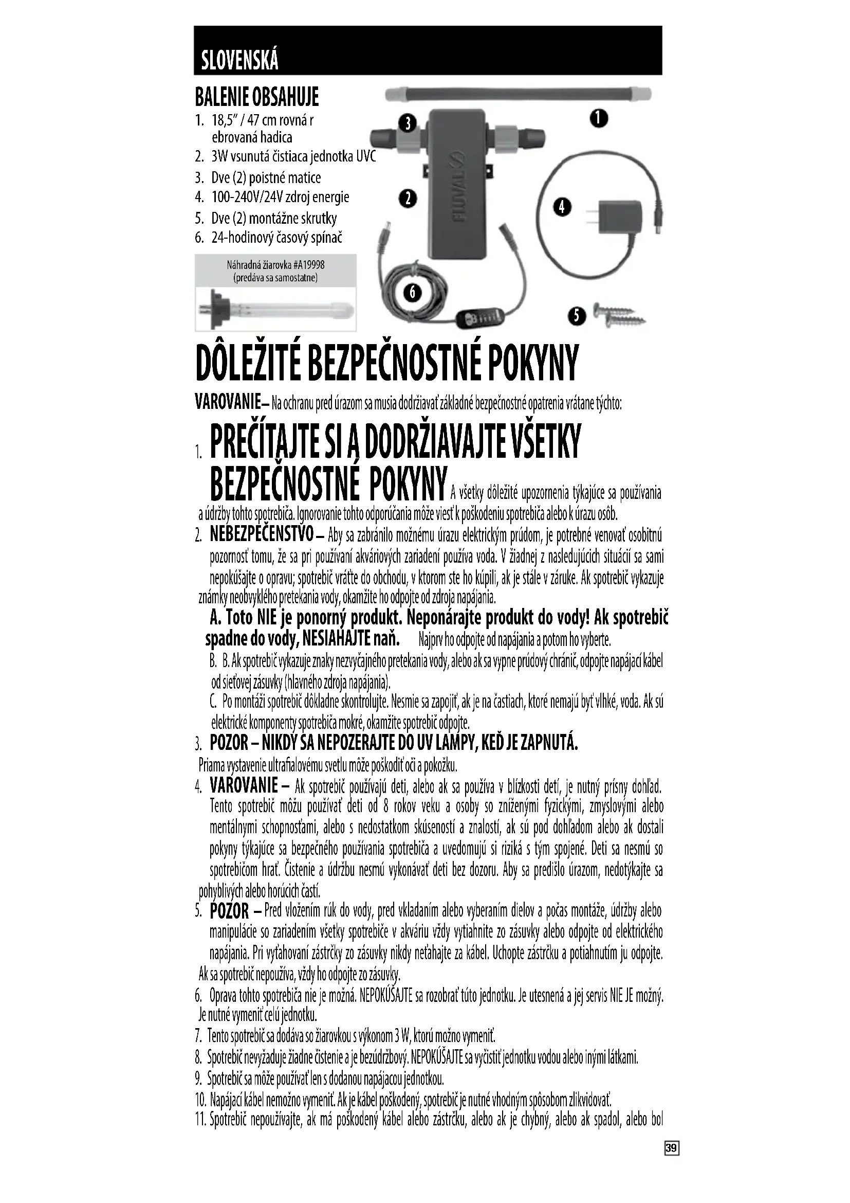 Na chybné diely a vyhotenie vsunutej cistacej Jednotky Flual UVC sa vztahue 3-roćna zaruka od datumu kupy. Tato zaruka plati iba s dokladom o kupe. Zaruka je obmedzena iba na opravu alebo yvmenu a nepokryva nasladnu skodu, stratu alebo poskodenie zvierat a obsoñné majetku ani poskodenie zhivych alebo neizvych predmetov bez ohladu na priciu. Tato zaruka plati len za beznych prevadzkovych podmienok, pre ktoré je tato Jednotka urcen. Nevztahuje sa na poskodenie spósobené neprimeranym pouzivanim, nedbalostou, nasprávnou montázou, neoprávnou manipuláciou, zneuzivanim alebo komercným pouzivanim. Zaruka sa nevztahue na opotrebovanie, poskodenie skla alebo dielov, ktoré neboli adekvatne alebo spravne udržiavané. TYMTO NIE SU DOTKNUTÉ VASE ZAKONNE PRAVA.