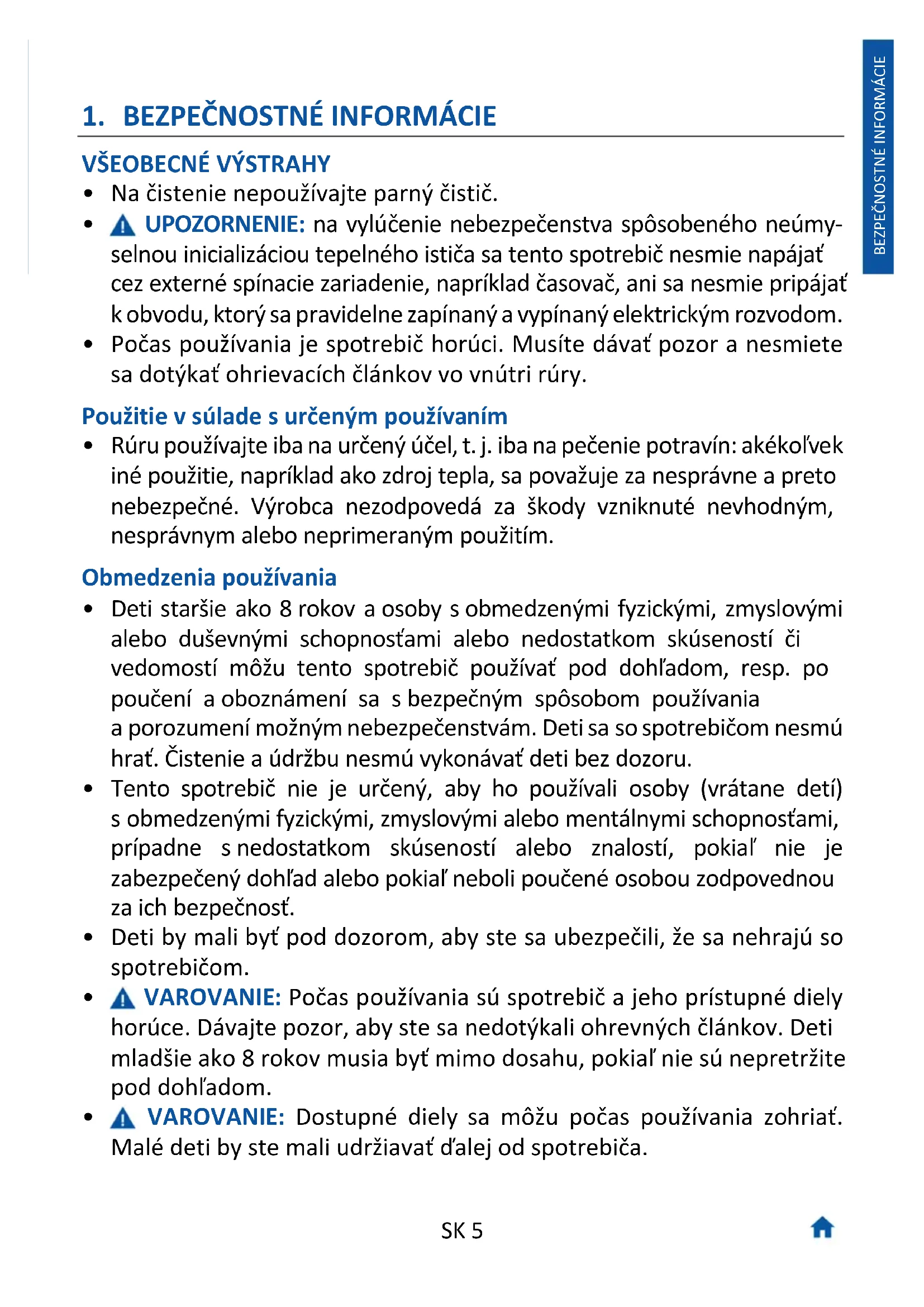 - Deti staršie ako 8 rokov a osoby s obmedzenými fyzickými, zmyslovými alebo duševnými schopnosťami alebo nedostatkom skúseností či vedomostí môžu tento spotrebič používať pod dohľadom, resp. po poučení a oboznámení sa s bezpečným spôsobom používania a porozumení možným nebezpečenstvám. Deti sa so spotrebičom nesmú hrať. Čistenie a údržbu nesmú vykonávať deti bez dozoru.